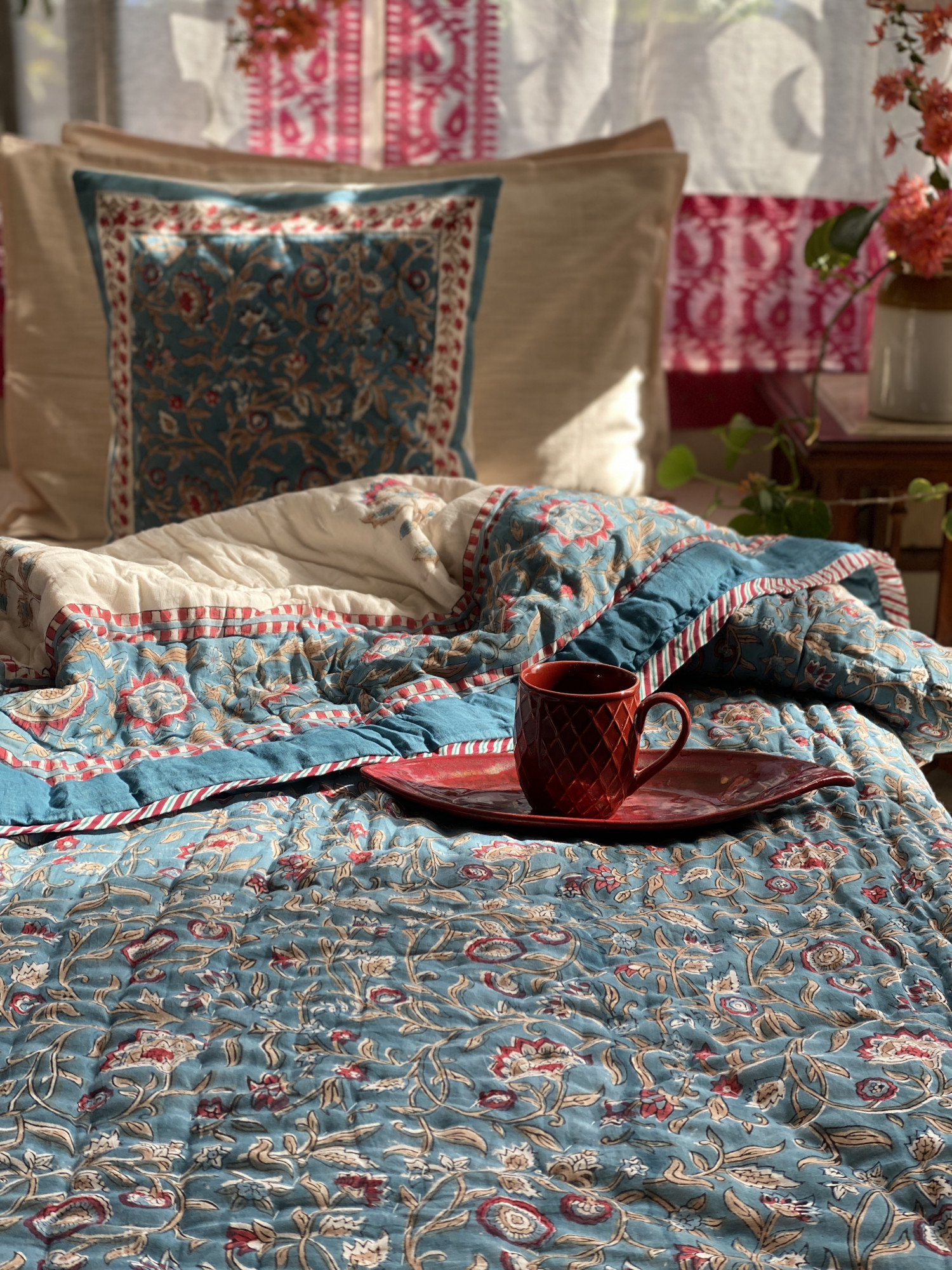 BLUE COTTON block print reversible (different block print design on each side) with cotton filling inside DOUBLE SIZE JAIPURI RAZAI