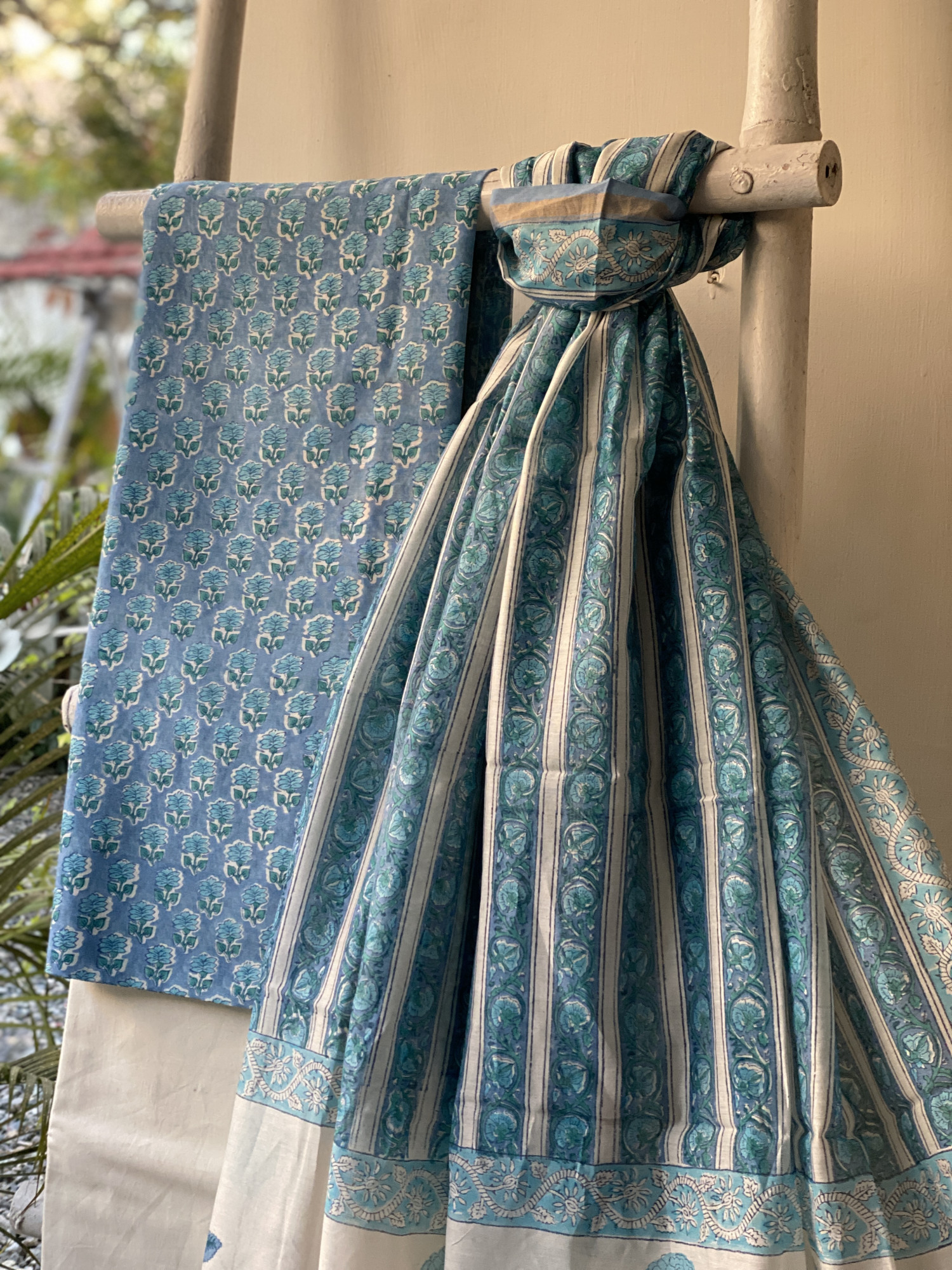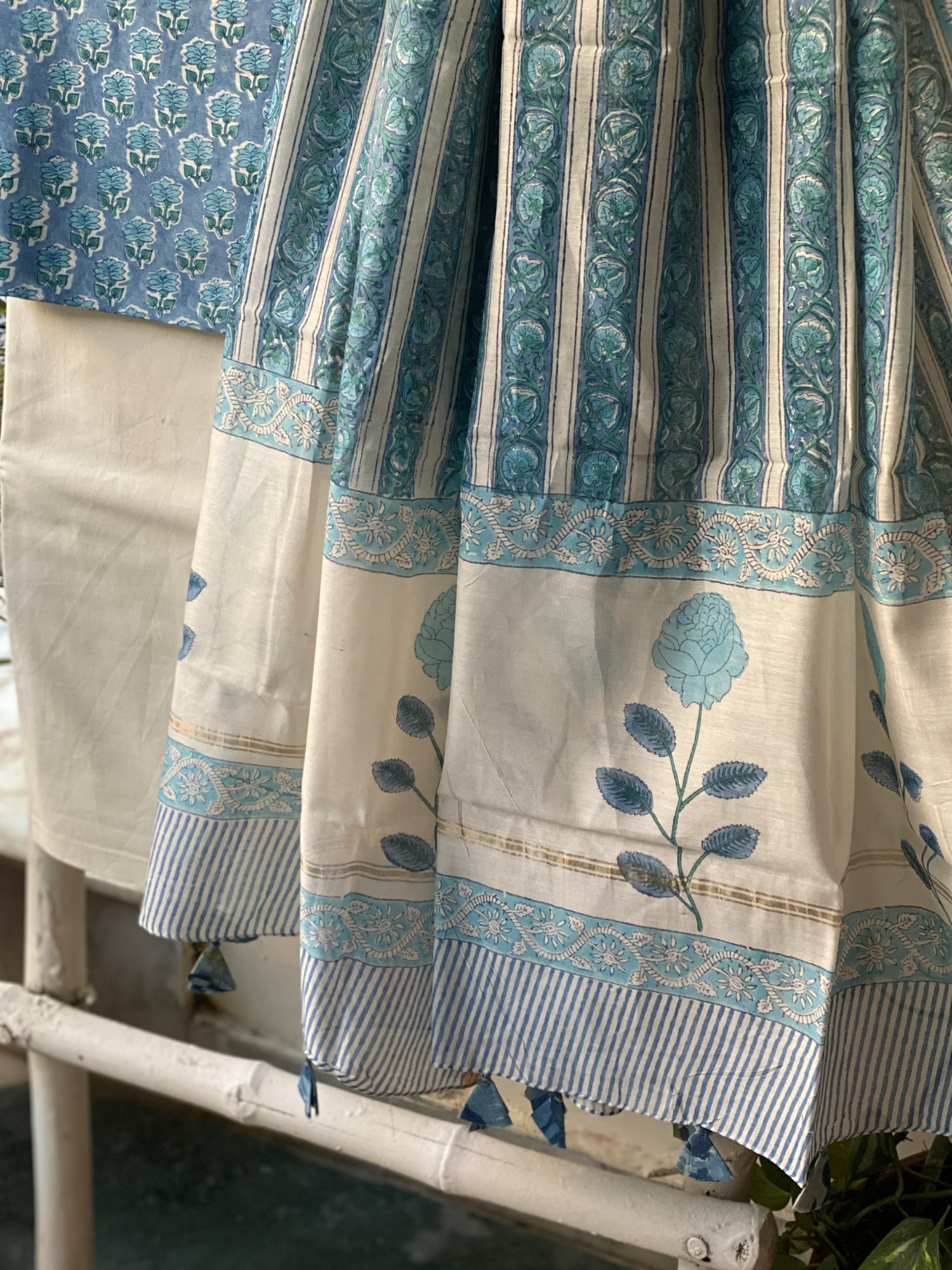BLUE CHANDERI HAND BLOCK PRINTED SILK & COTTON ZARI WOVEN BORDER SHIRT WITH AN OFF WHITE HAND BLOCK PRINTED COTTON MULL BOTTOM PAIRED WITH A BLUE HAND BLOCK PRINT CHANDERI ZARI WOVEN BORDER DUPATTA, ACCESSORISED WITH TASSLES.