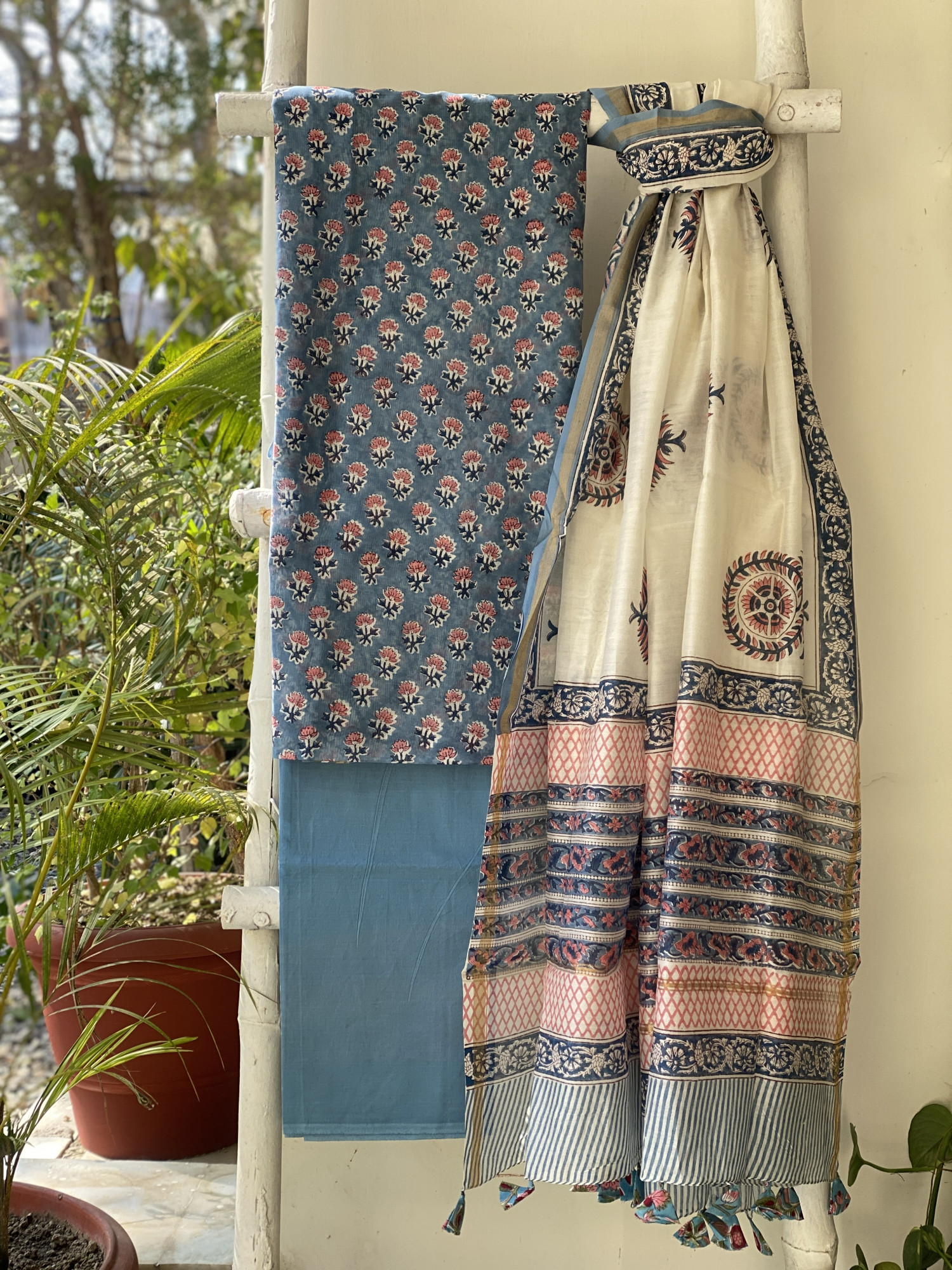 BLUE CHANDERI HAND BLOCK PRINTED SILK & COTTON ZARI WOVEN BORDER SHIRT WITH A BLUE PLAIN COTTON MULL BOTTOM PAIRED WITH AN OFF WHITE HAND BLOCK PRINT CHANDERI ZARI WOVEN BORDER DUPATTA, ACCESSORISED WITH TASSLES.