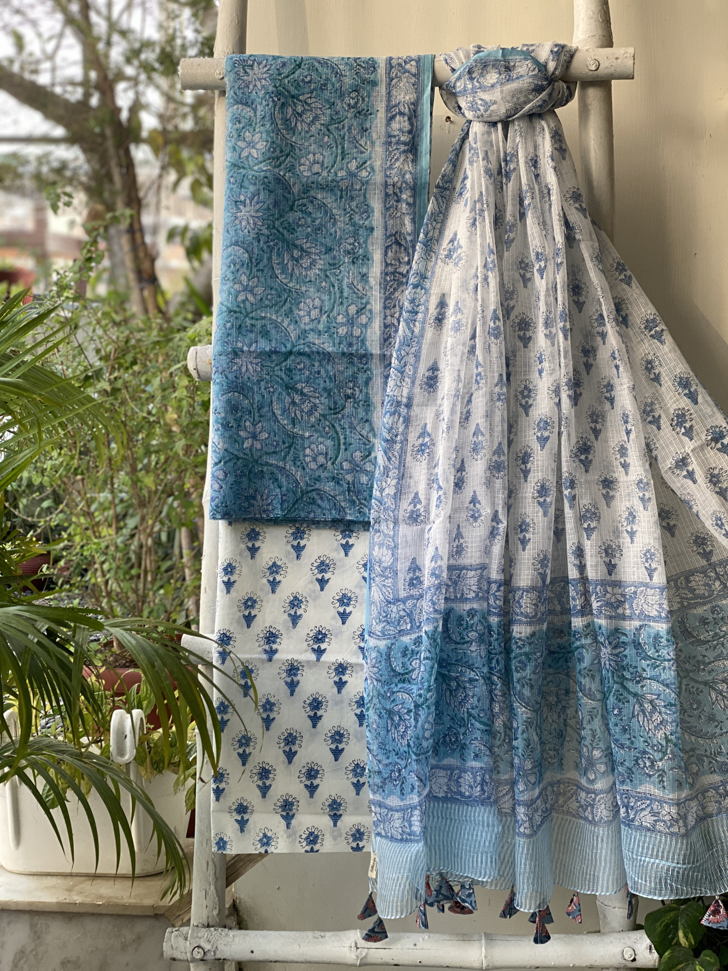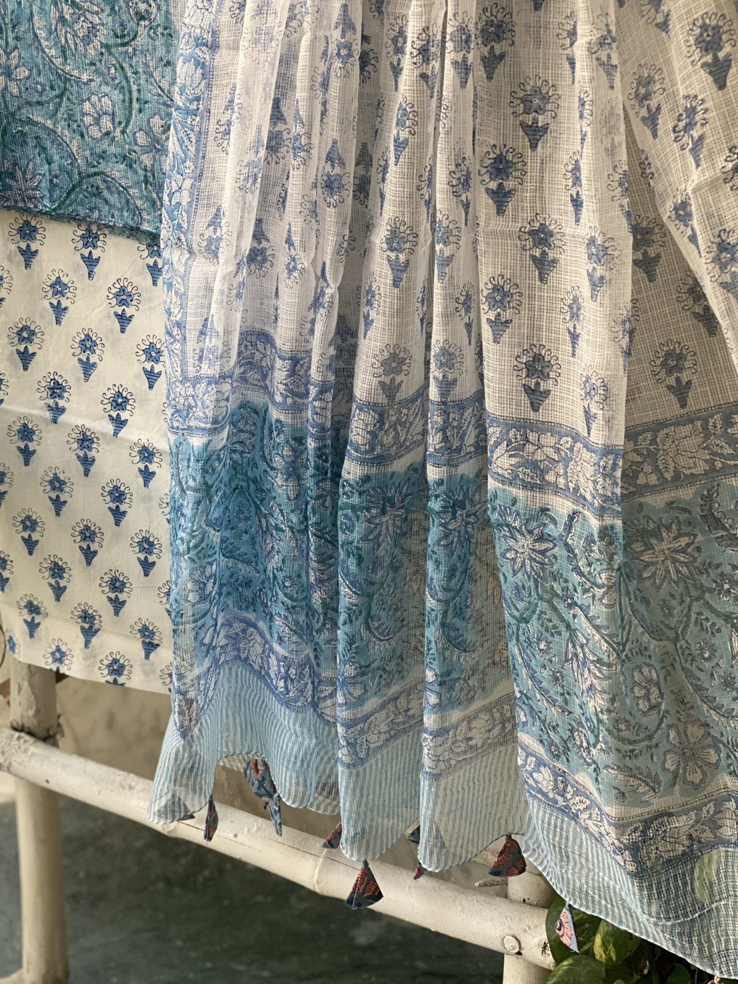 BLUE HAND BLOCK PRINT KOTA SHIRT (COMES WITH A MATCHING COTTON LINING PIECE) AND AN OFF WHITE COTTON BLOCK PRINT BOTTOM PAIRED WITH AN OFF WHITE KOTA BLOCK PRINT DUPATTA, ACCESSORISED WITH TASSLES.