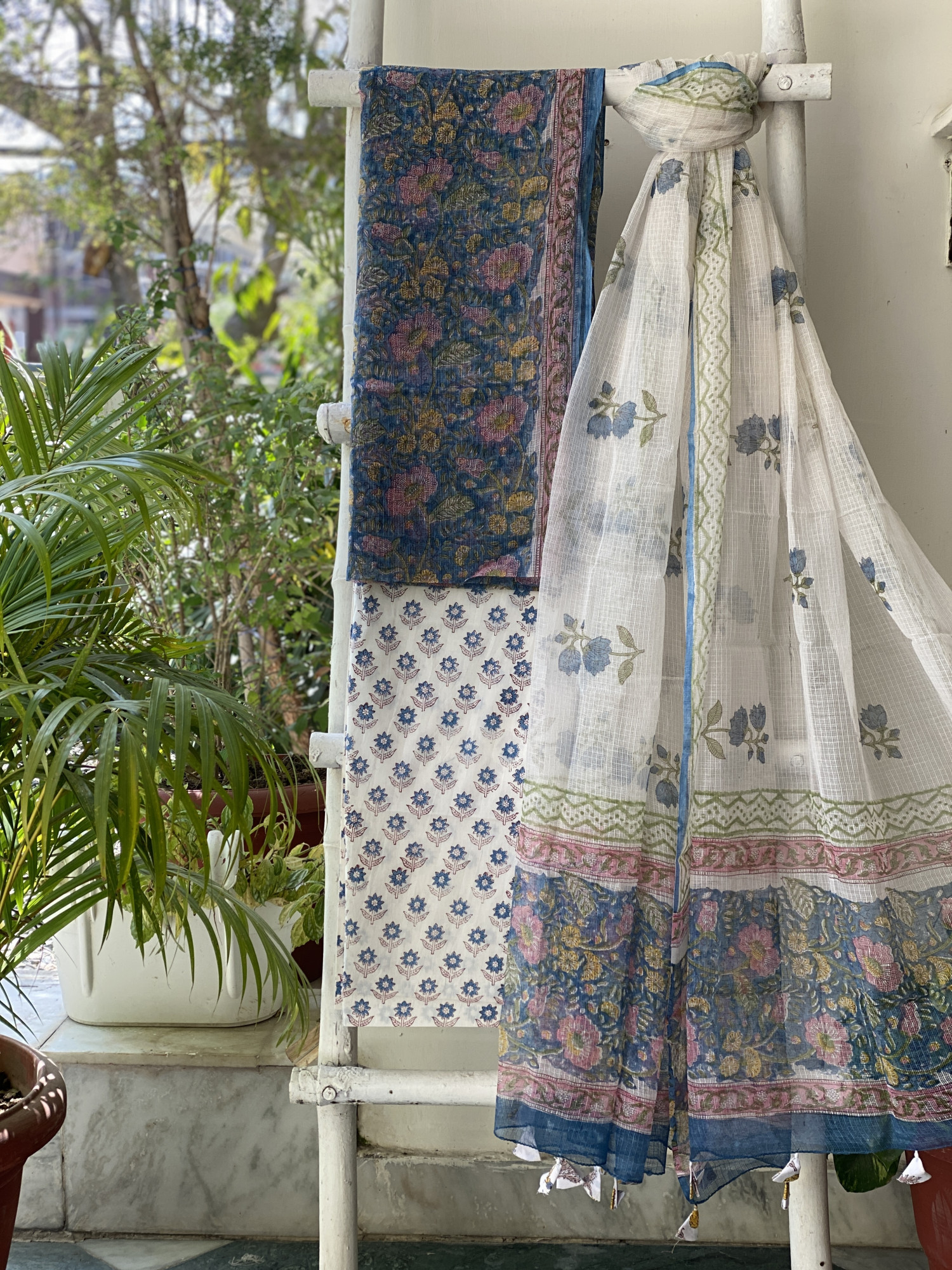 BLUE HAND BLOCK PRINT KOTA SHIRT (COMES WITH A MATCHING COTTON LINING PIECE) AND AN OFF WHITE COTTON BLOCK PRINT BOTTOM PAIRED WITH AN OFF WHITE KOTA BLOCK PRINT DUPATTA, ACCESSORISED WITH TASSLES.