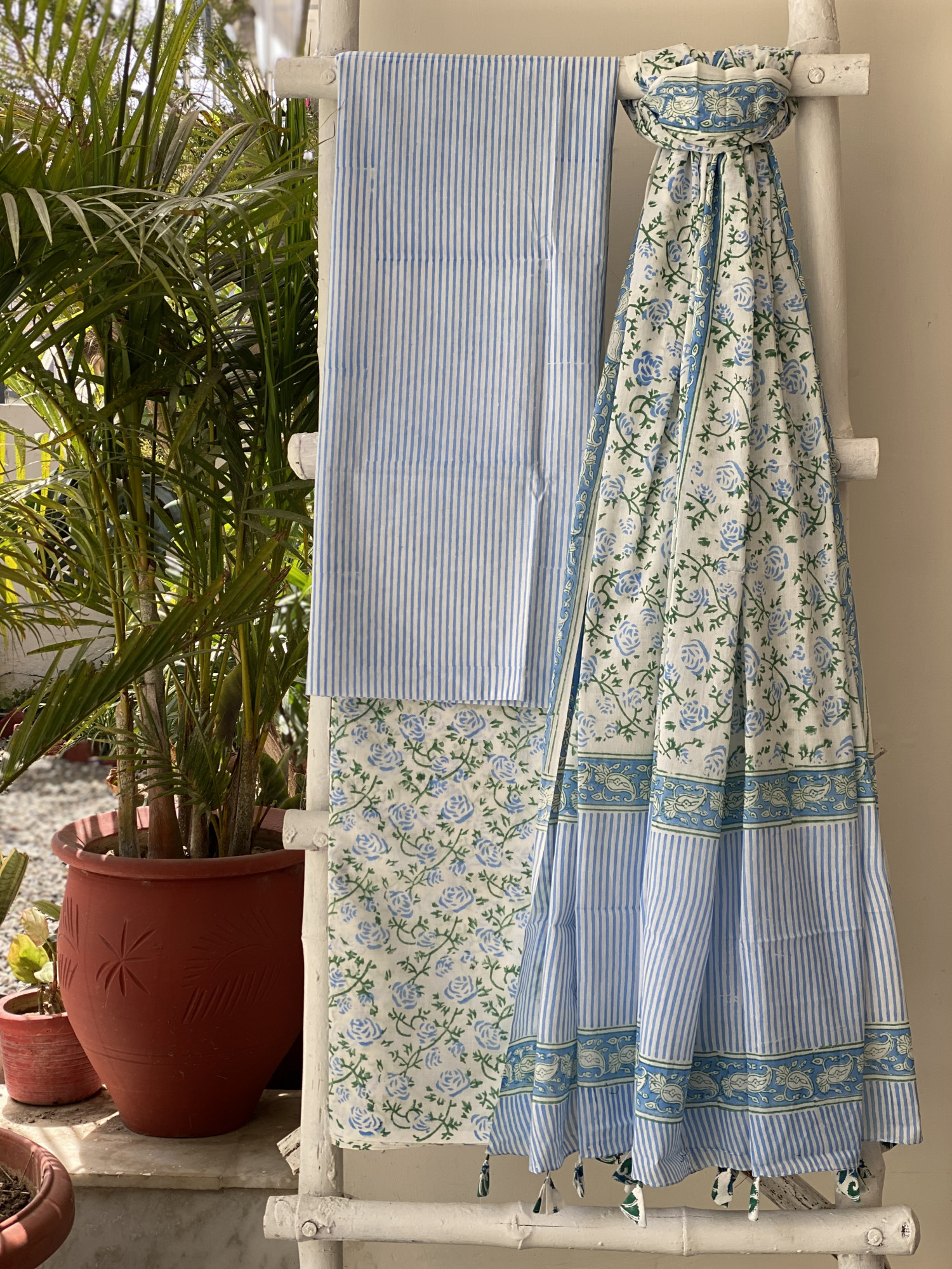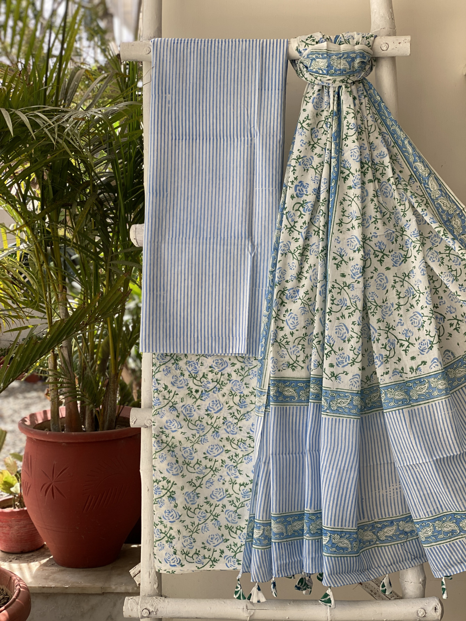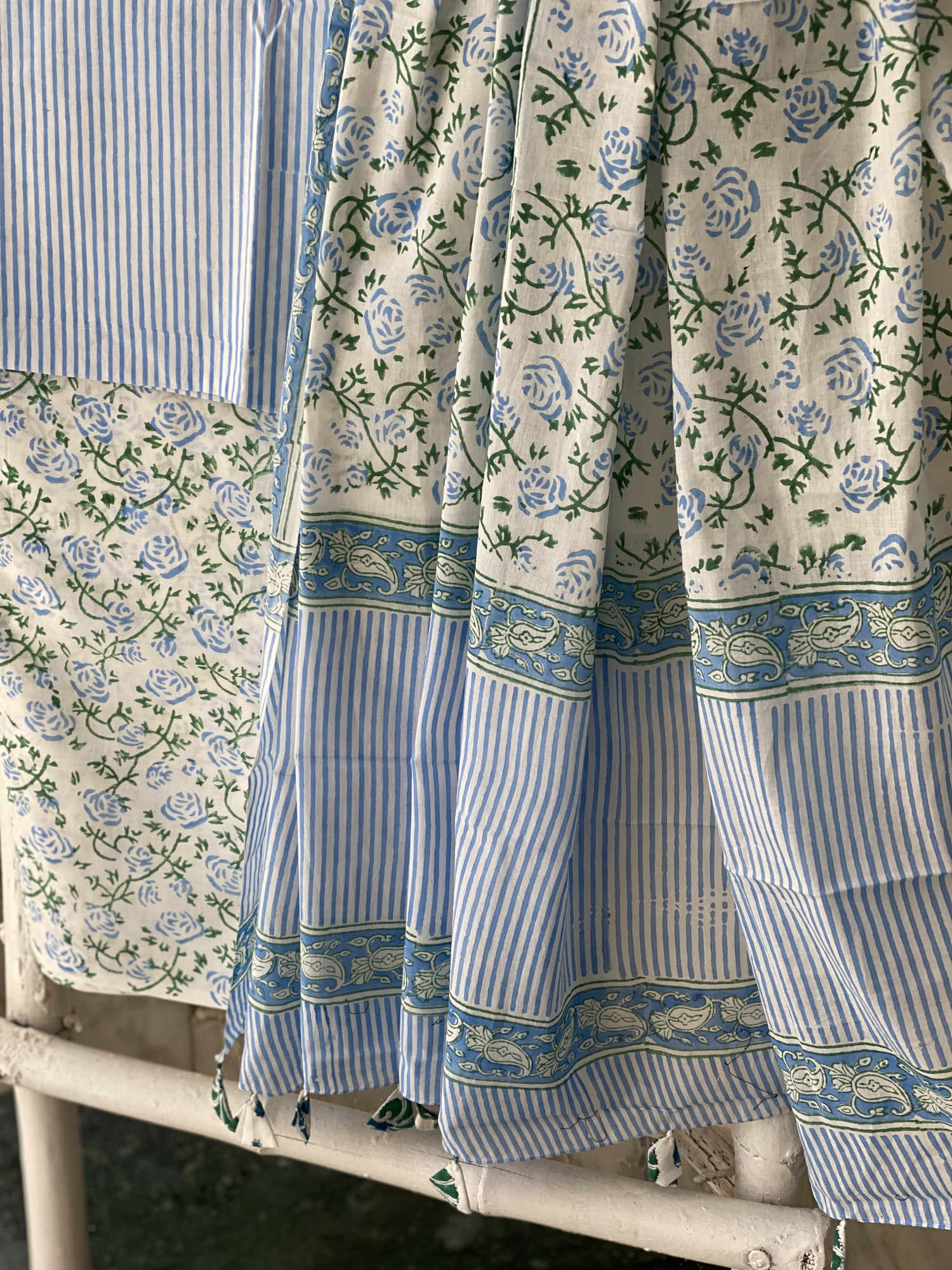 BLUE-WHITE HAND BLOCK PRINT MUL COTTON SHIRT AND AN OFF WHITE BLOCK PRINTED MUL COTTON BOTTOM, PAIRED WITH AN OFF WHITE MUL COTTON HAND BLOCK PRINT DUPATTA, ACCESSORISED WITH TASSLES.