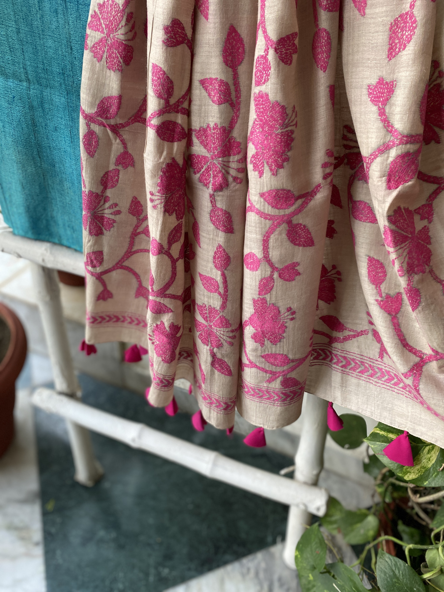 BLUE GICHA TUSSAR SILK SHIRT AND BOTTOM paired with AN OFF WHITE KANTHA HAND EMBROIDERED SILK dupatta AND accessorised with tassles.