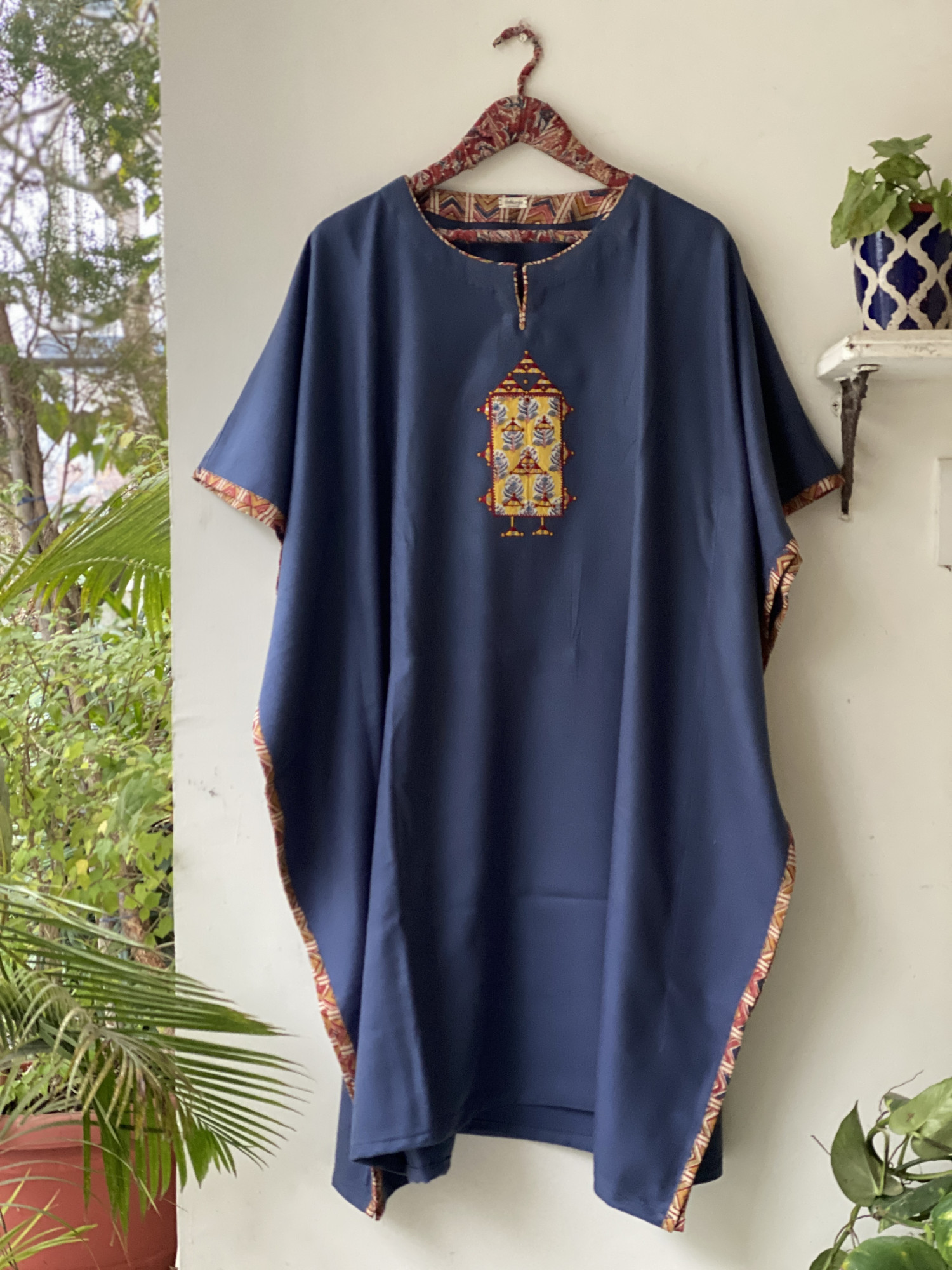 BLUISH-GREY WOOLLEN KAFTAN, WITH PATCHWORK AND MANUAL MACHINE EMBROIDERY.