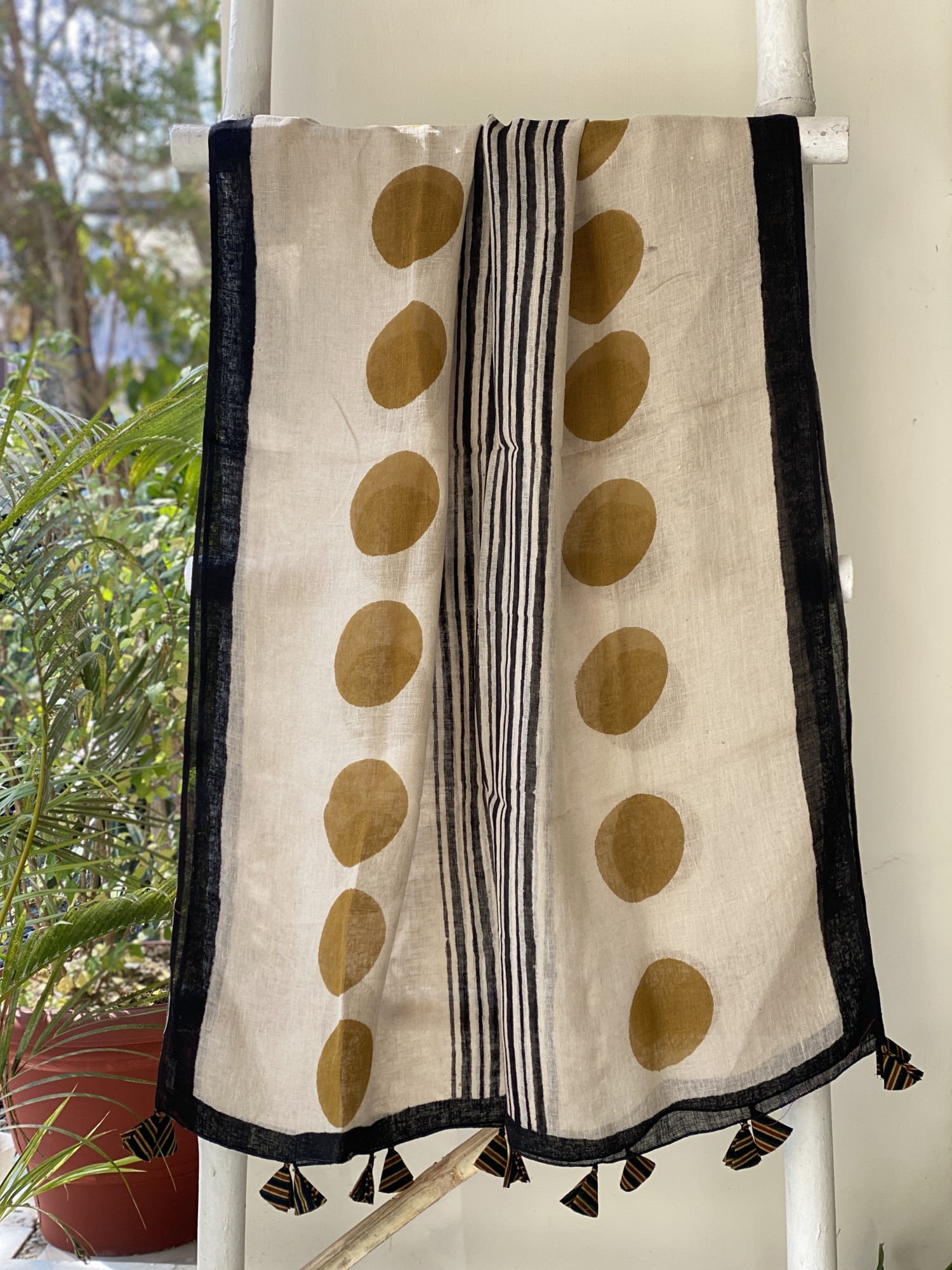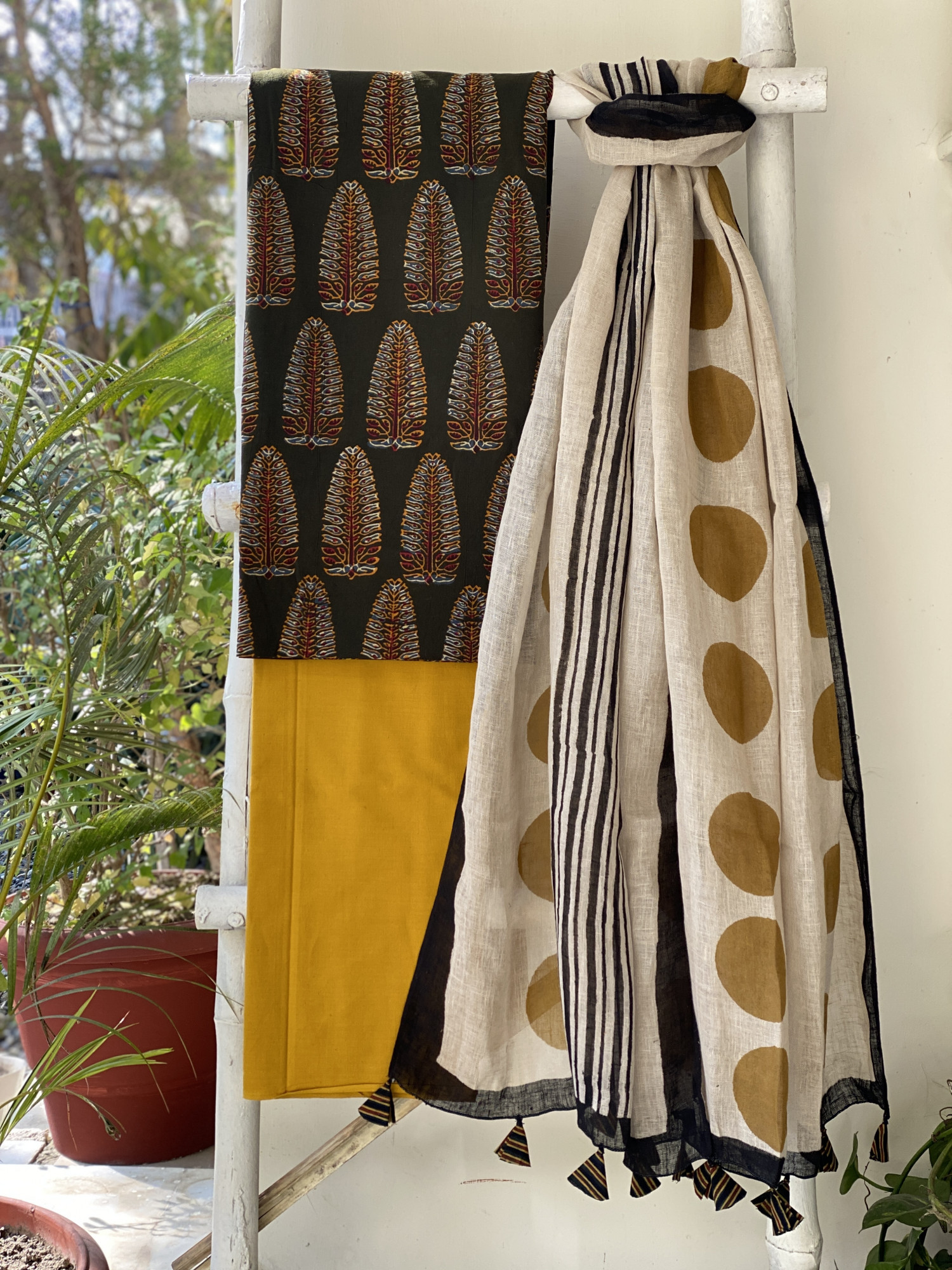 BOTTLE GREEN-BEIGE BLOCK PRINT LINEN DUPATTA SUIT SET