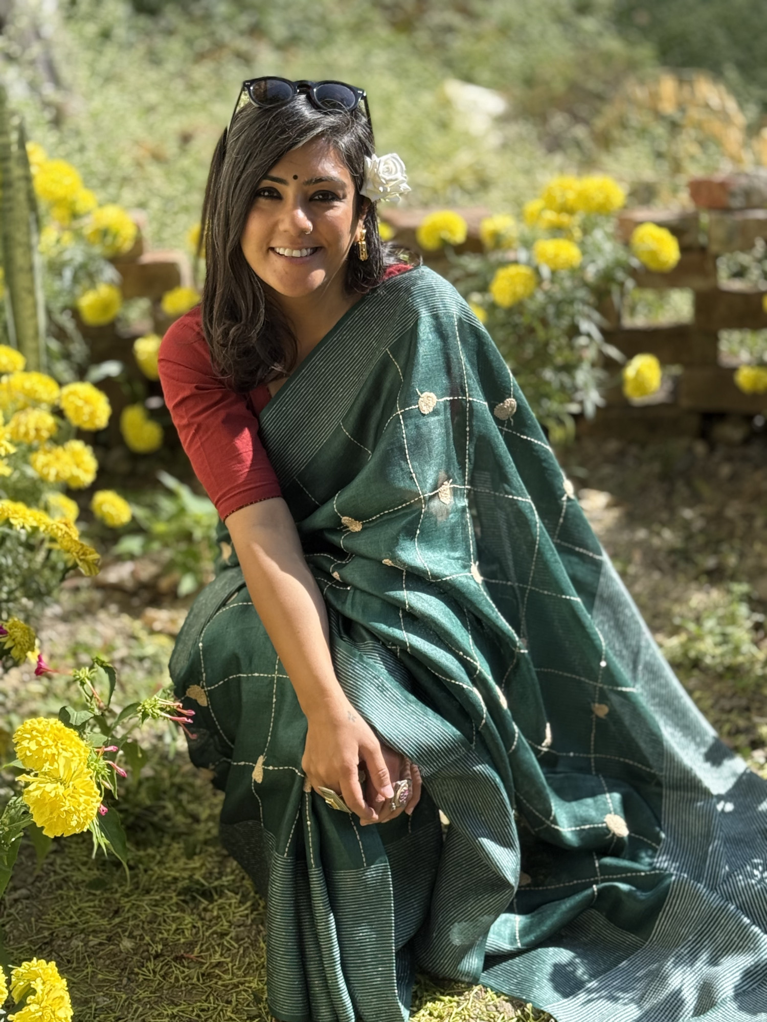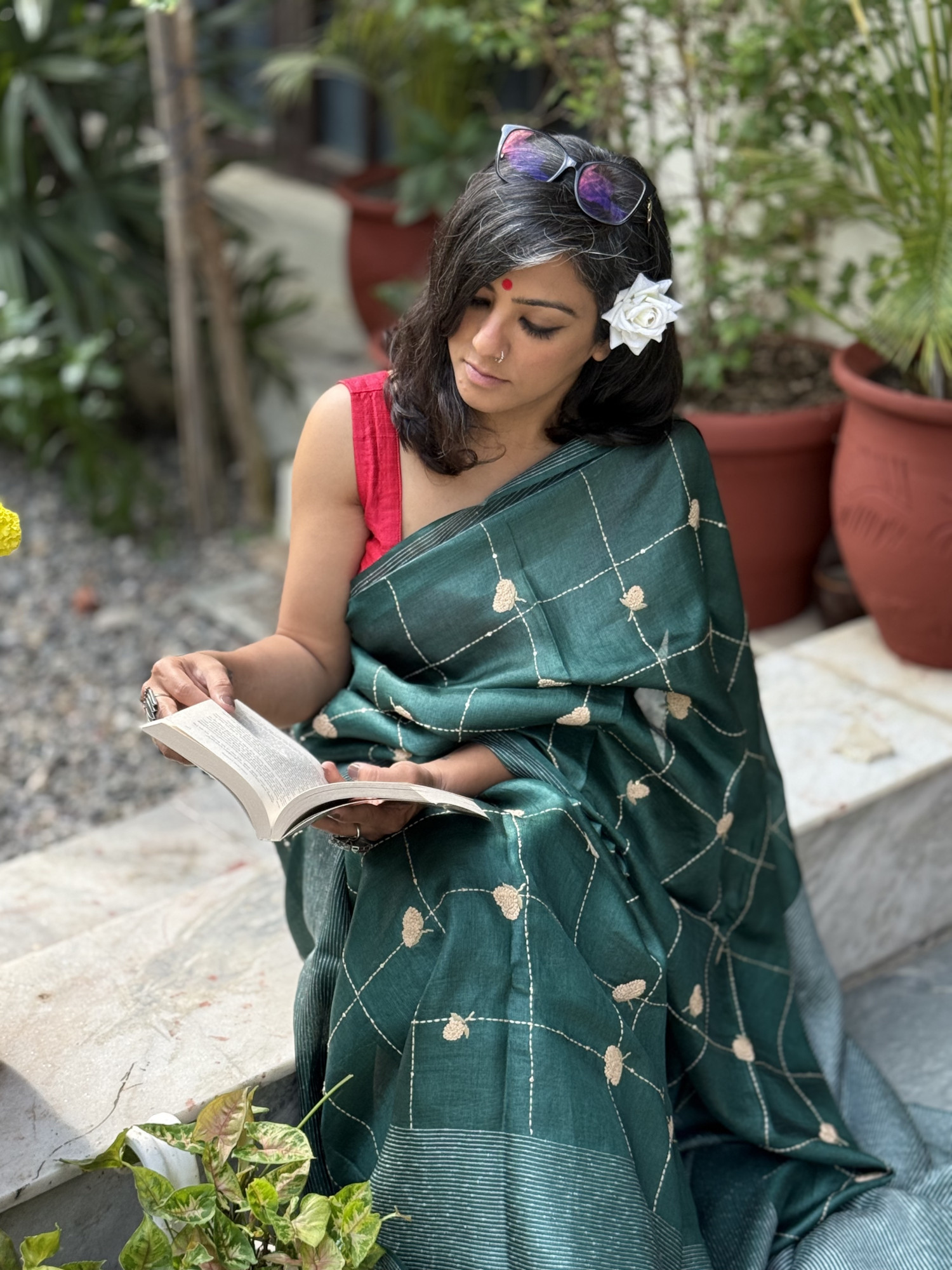 BOTTLE GREEN NATURAL DYED KORA SILK SARI WITH HAND EMBROIDERY ALL OVER , ACCESSORISED WITH TASSELS