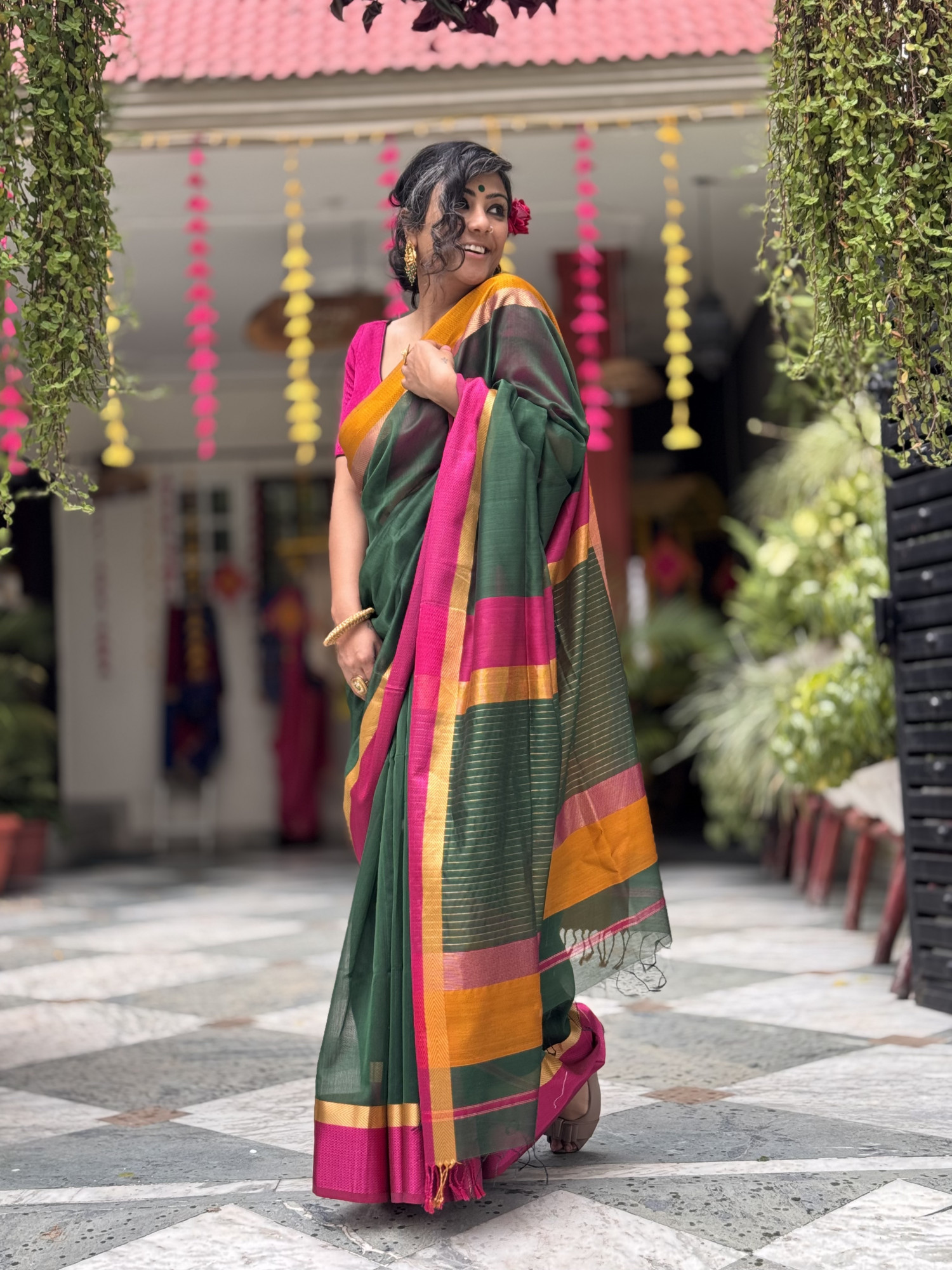BOTTLE GREEN MAHESHWARI SILK AND COTTON SARI WITH WOVEN RESHAM- ZARI BORDER AND PALLA .