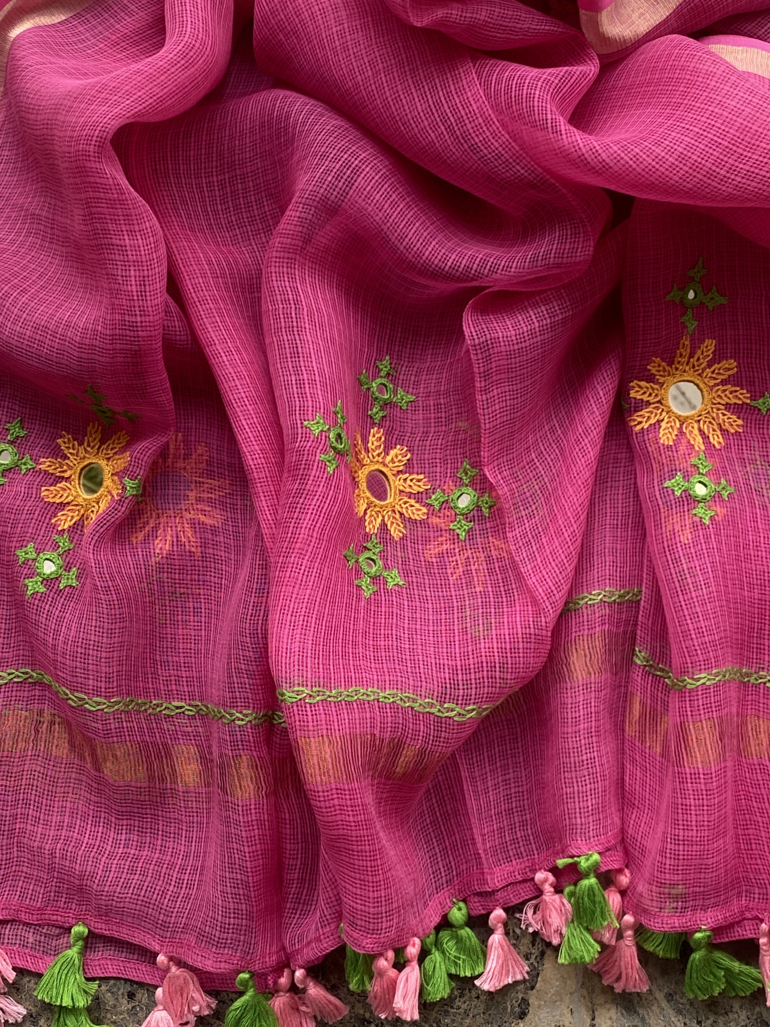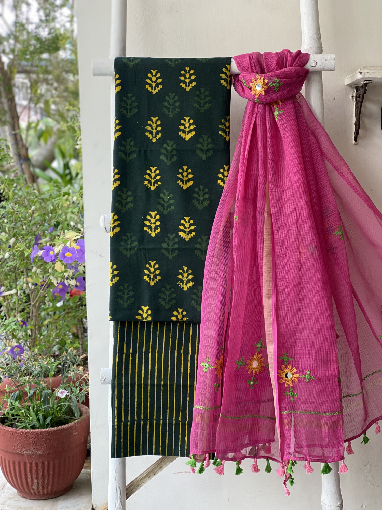BOTTLE GREEN HAND BLOCK PRINT COTTON SHIRT AND A BOTTLE GREEN STRIPED BLOCK PRINTED COTTON BOTTOM PAIRED WITH A PINK KOTA HAND EMBROIDERED DUPATTA WITH ZARI WOVEN BORDER, ACCESSORISED WITH TASSLES.