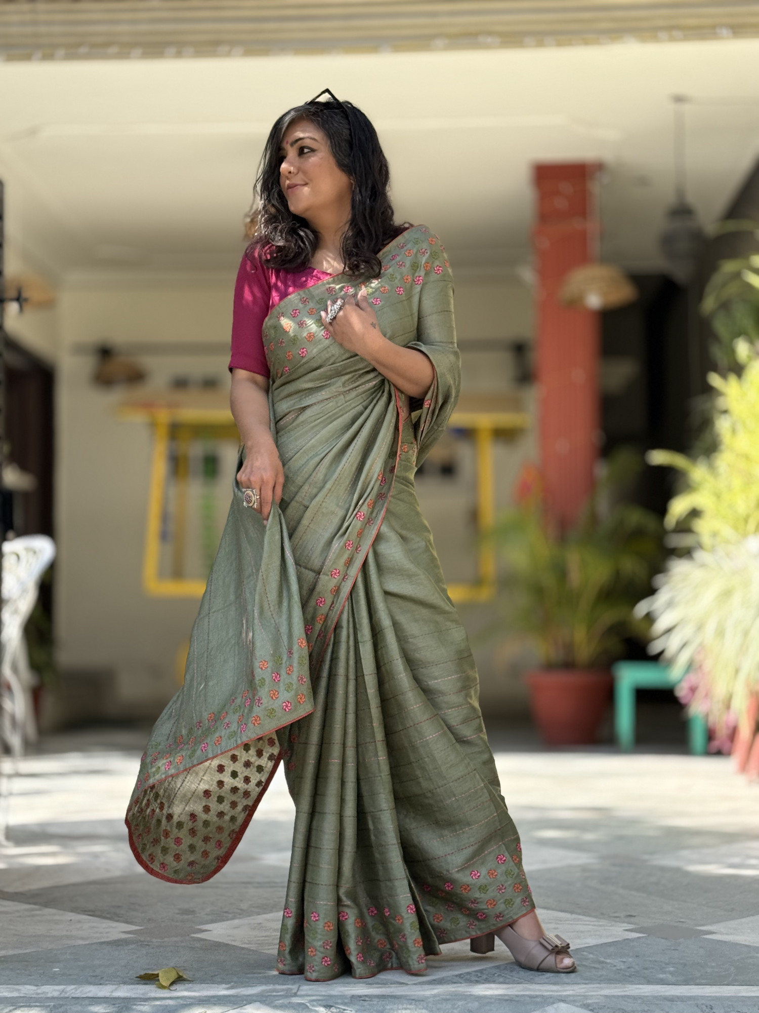 Comes with its own PISTA GREEN EMBROIDERED TUSSAR SILK BLOUSE AND AN EXTRA RED COTTON TUSSAR BLOUSE PIECE ( 90 cm)