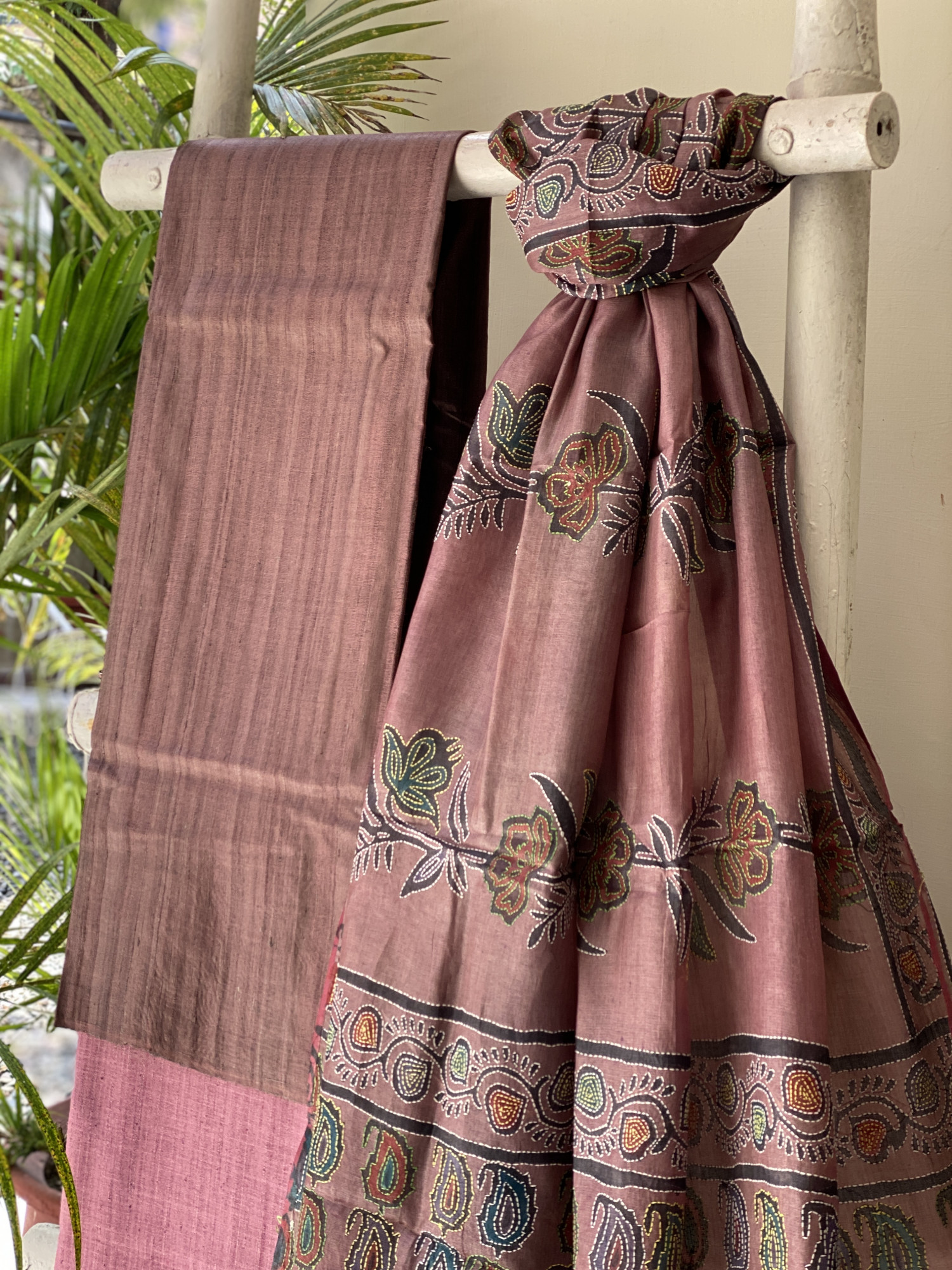 BROWN GICHA TUSSAR SILK shirt AND PINK COTTON TUSSAR BOTTOM paired with A BROWN KANTHA HAND EMBROIDERED SILK dupatta AND accessorised with tassles.