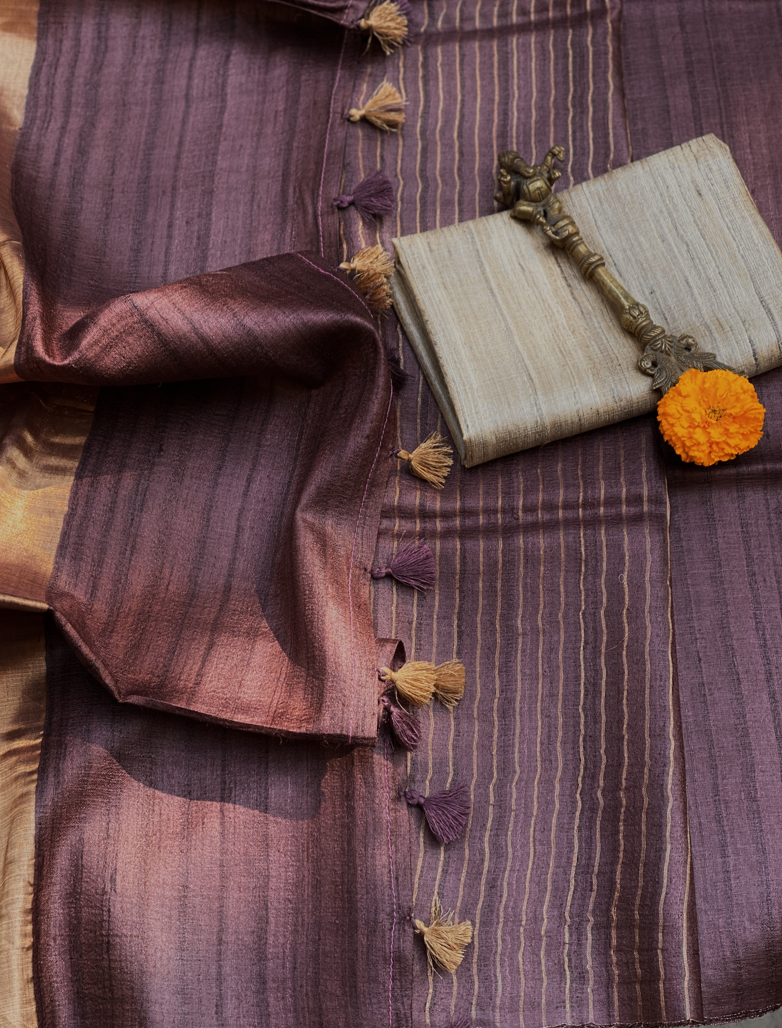 BROWN DESI TUSSAR WOVEN SILK sari with WITH DOUBLE ZARI patta WOVEN PALLA accessorised with tassles.