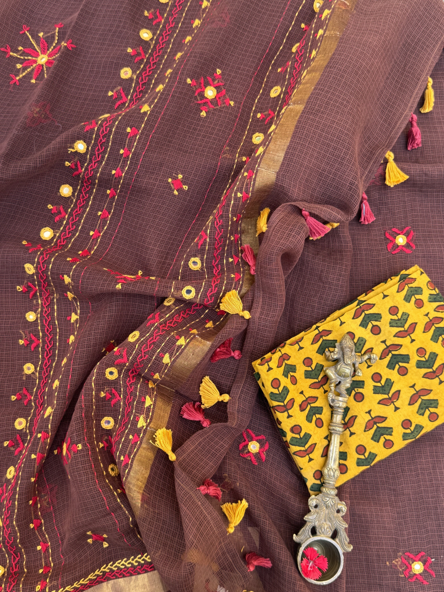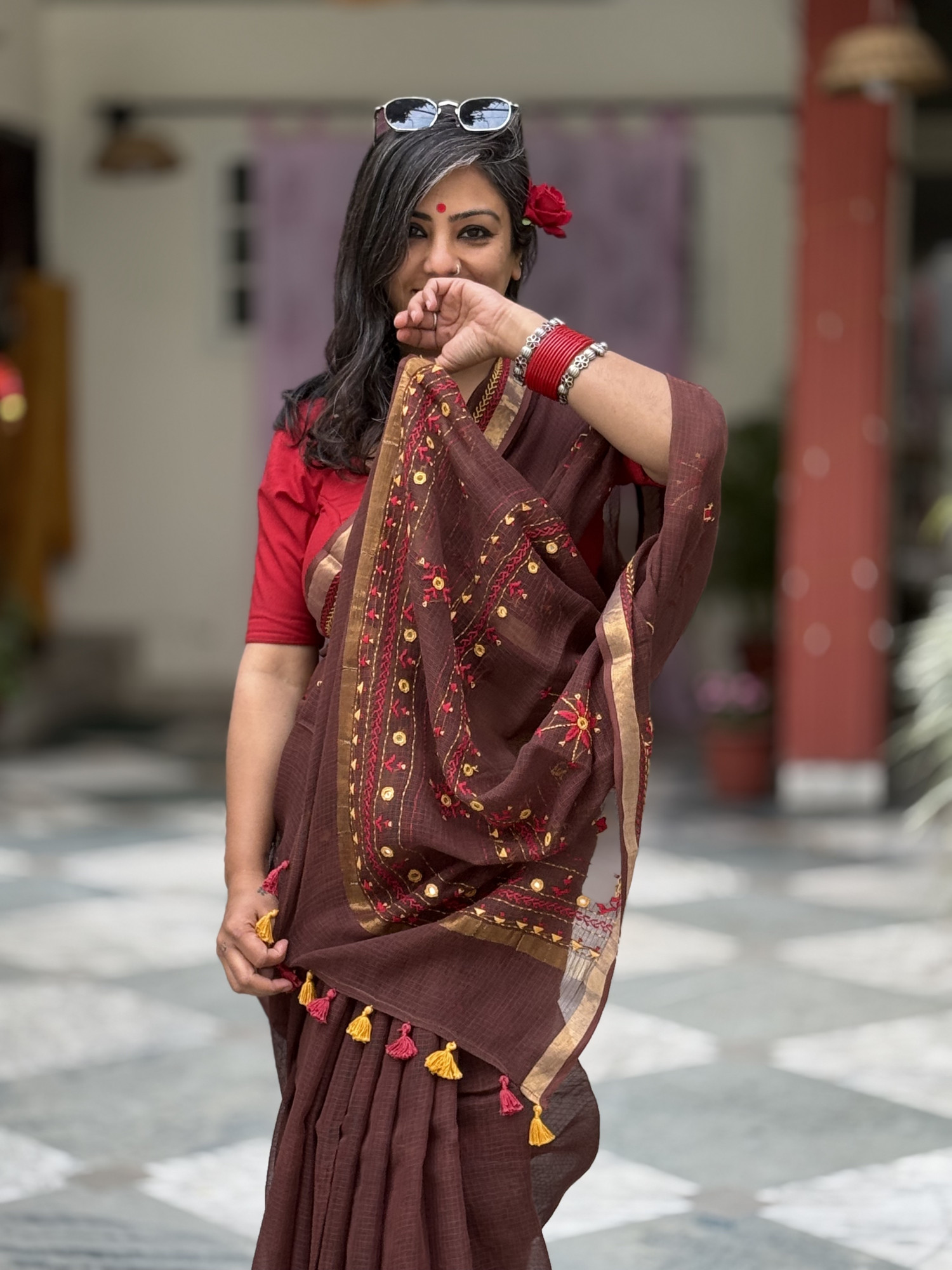 BROWN Kota cotton hand embroidery sari, with a zari woven border, accessorised with tassels.