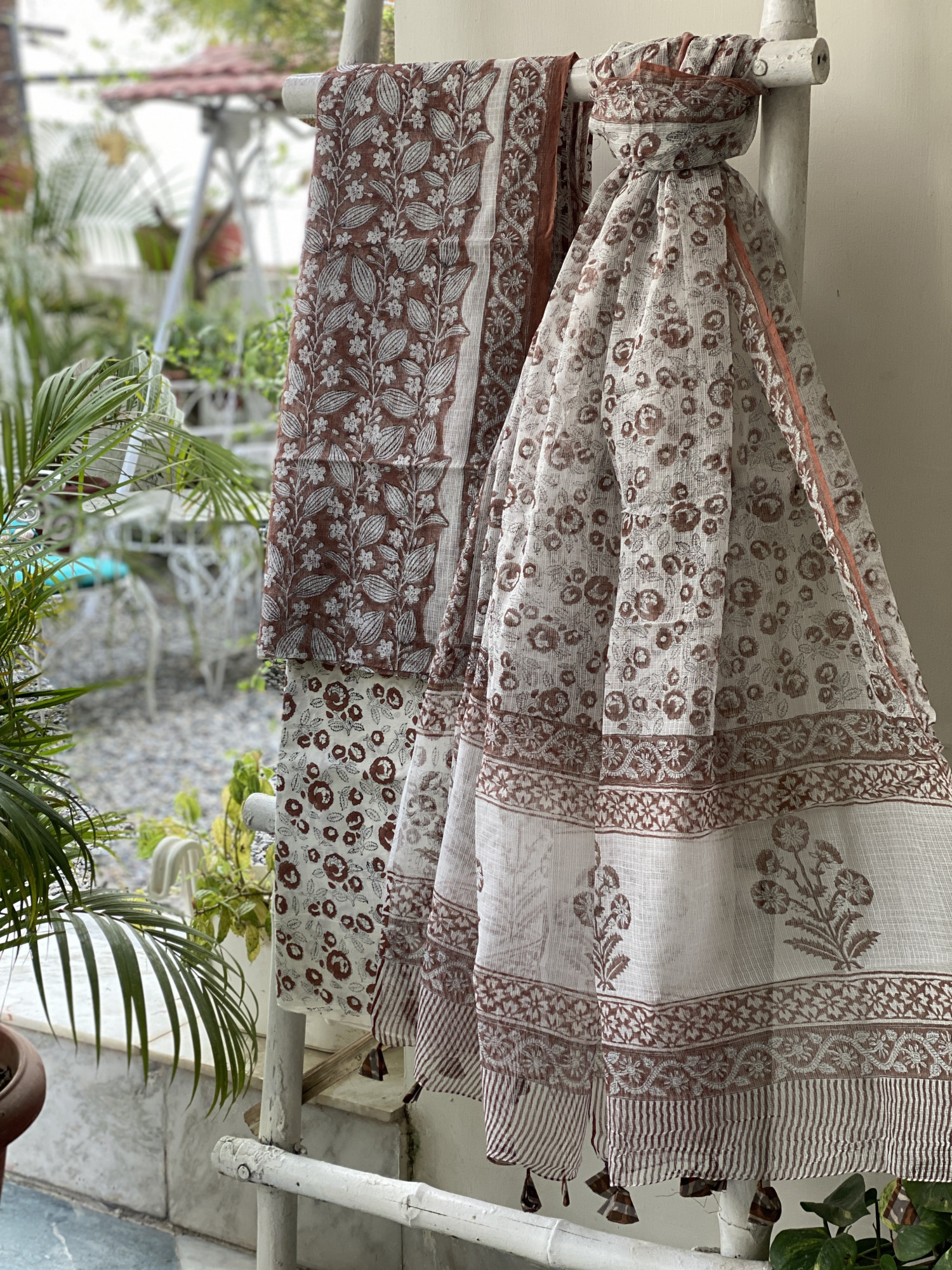 BROWN HAND BLOCK PRINT KOTA SHIRT (COMES WITH A MATCHING COTTON LINING PIECE) AND AN OFF WHITE COTTON BLOCK PRINT BOTTOM PAIRED WITH AN OFF WHITE KOTA BLOCK PRINT DUPATTA, ACCESSORISED WITH TASSLES.