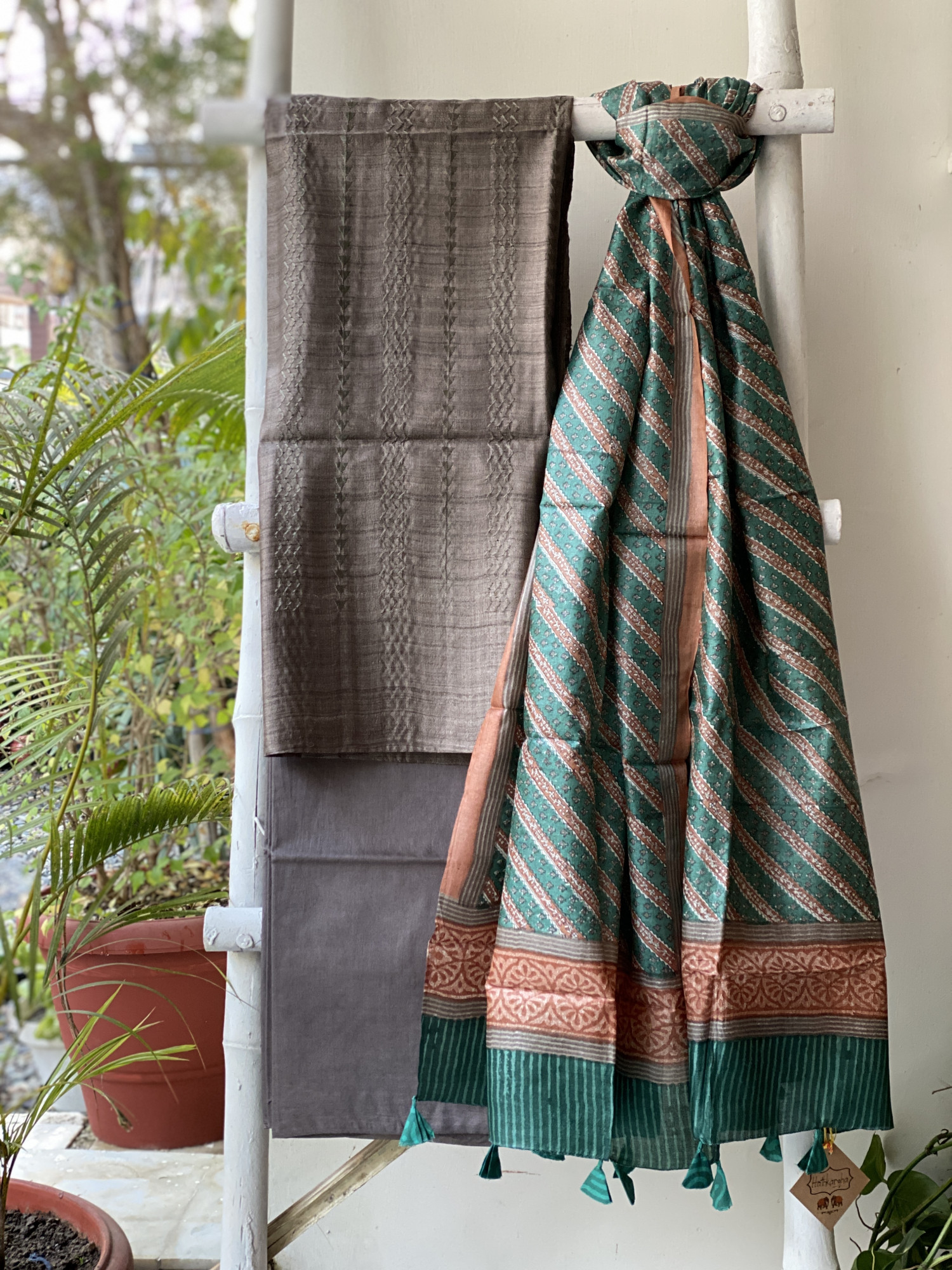 BROWN TUSSAR SILK SHIRT WITH EMBROIDERY AND BROWN HANDLOOM SILK BOTTOM PAIRED WITH A TEAL TUSSAR SILK PRINTED DUPATTA. ACCESSORISED WITH TASSELS