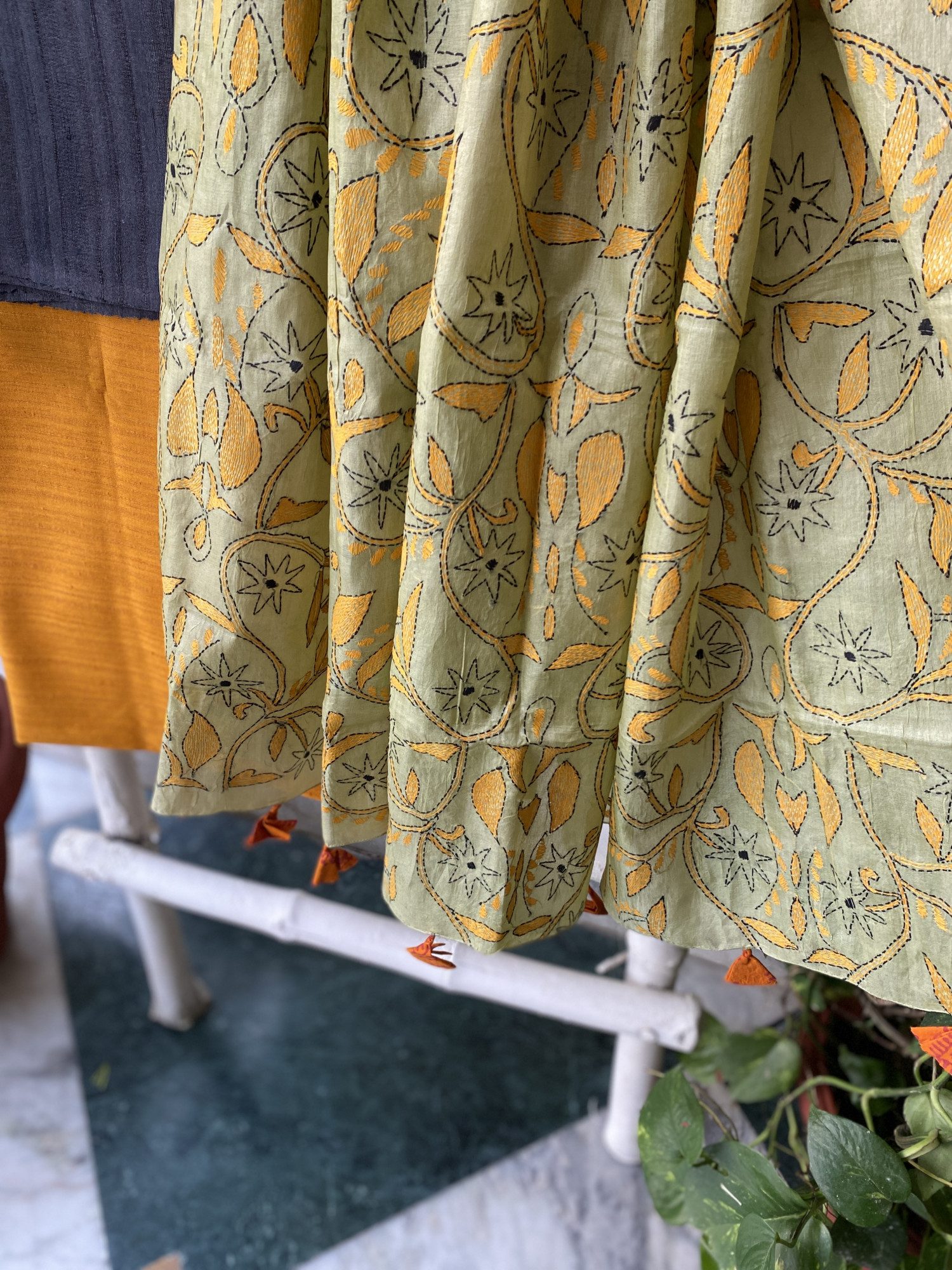 CHARCOAL BLACK GICHA TUSSAR SILK shirt AND YELLOW COTTON TUSSAR BOTTOM paired with A MINT GREEN KANTHA HAND EMBROIDERED SILK dupatta AND accessorised with tassles.