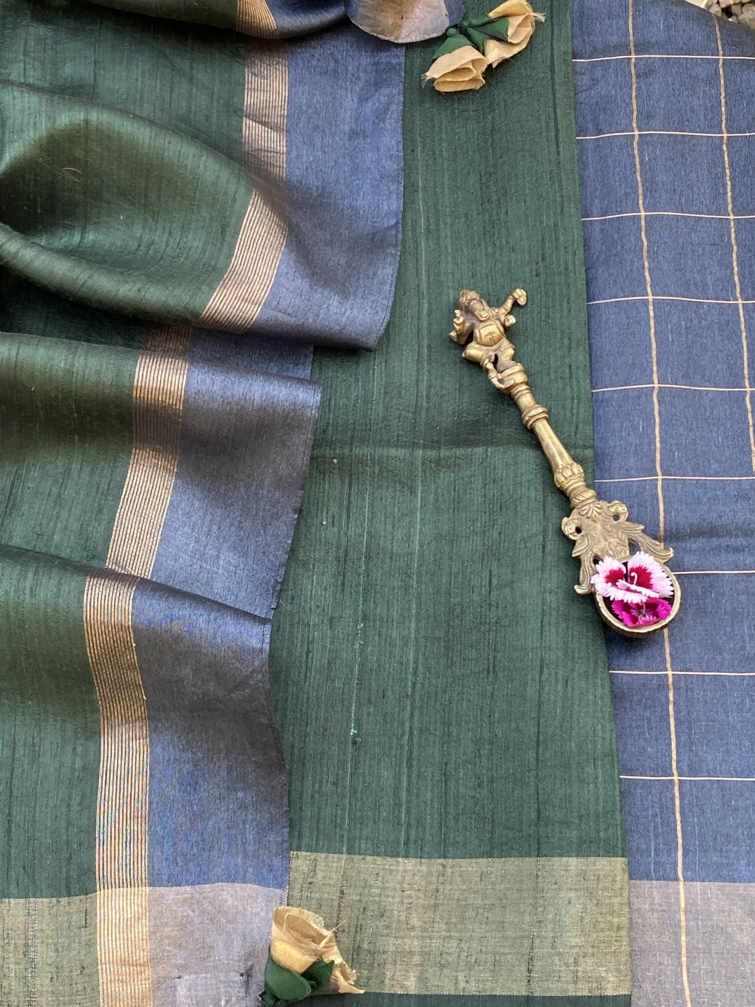 CHARCOAL-GREEN HAND WOVEN TUSSAR SILK SARI