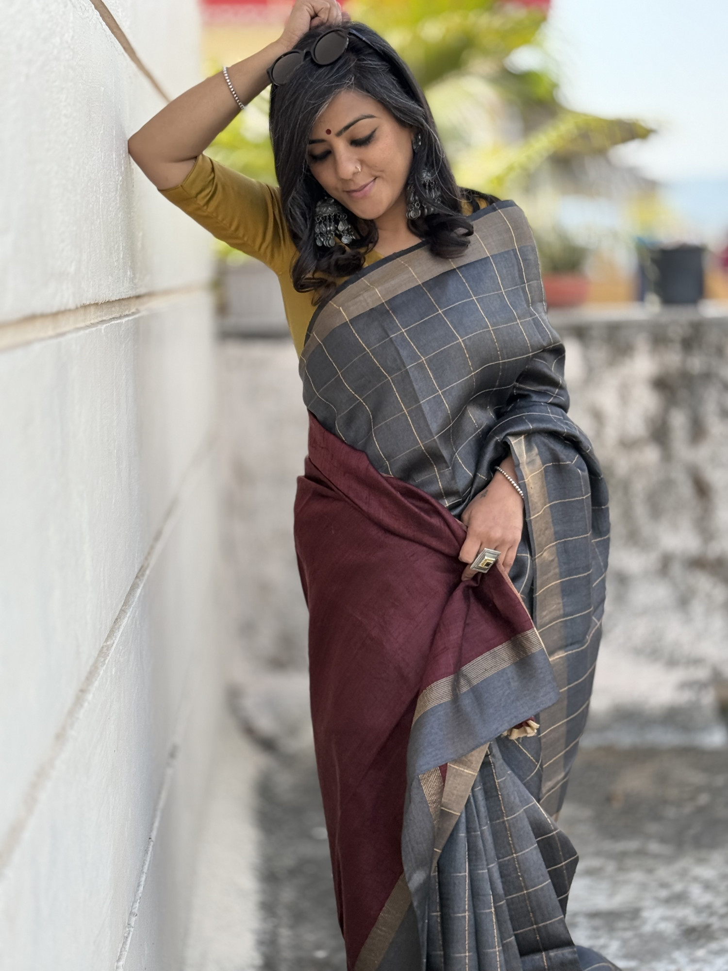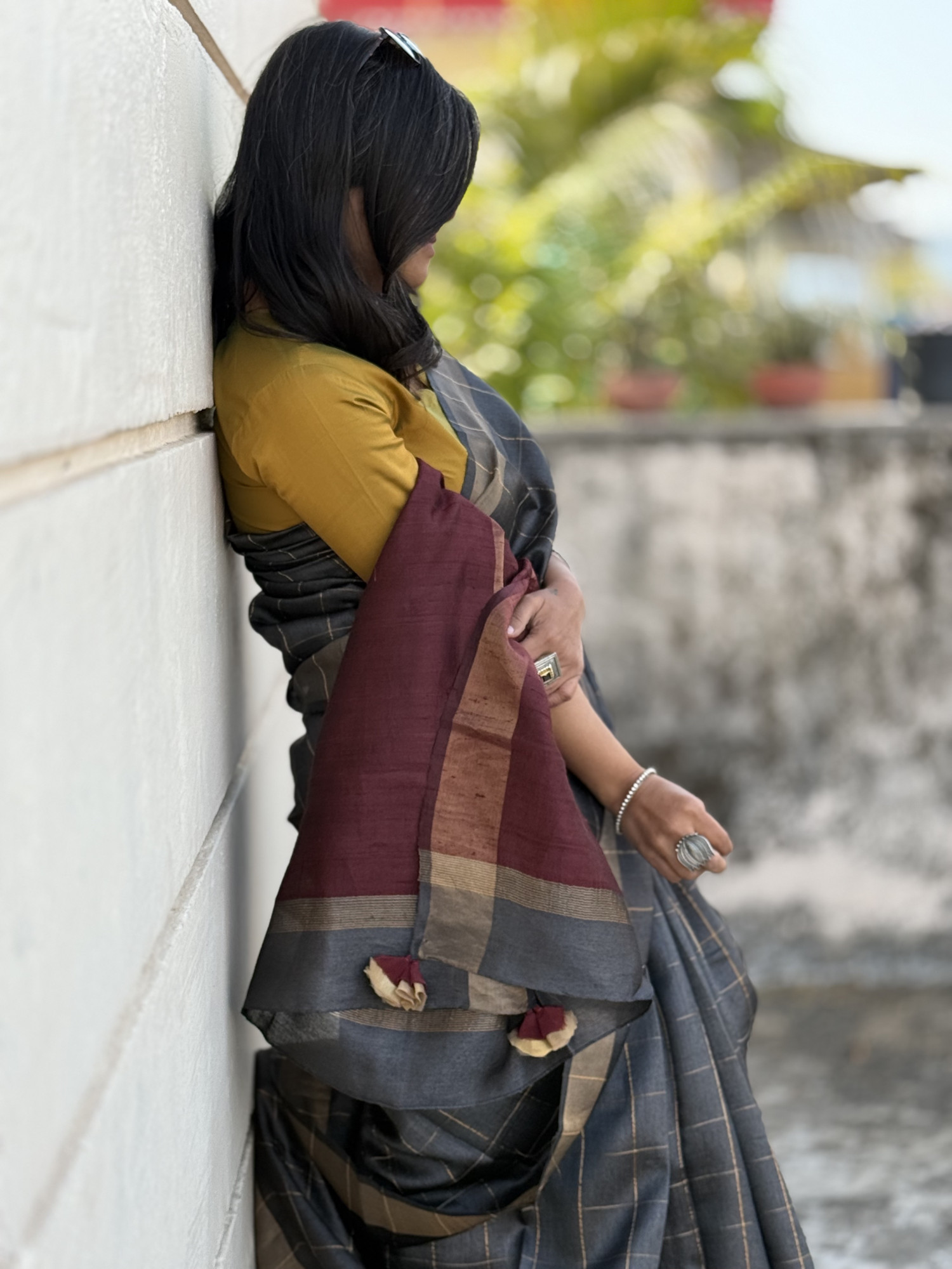 CHARCOAL-MAROON ZARI CHECKERED HAND WOVEN TUSSAR SILK SARI WITH ZARI WOVEN BORDER AND MAROON PALLA, ACCESSORISED WITH TASSLES.