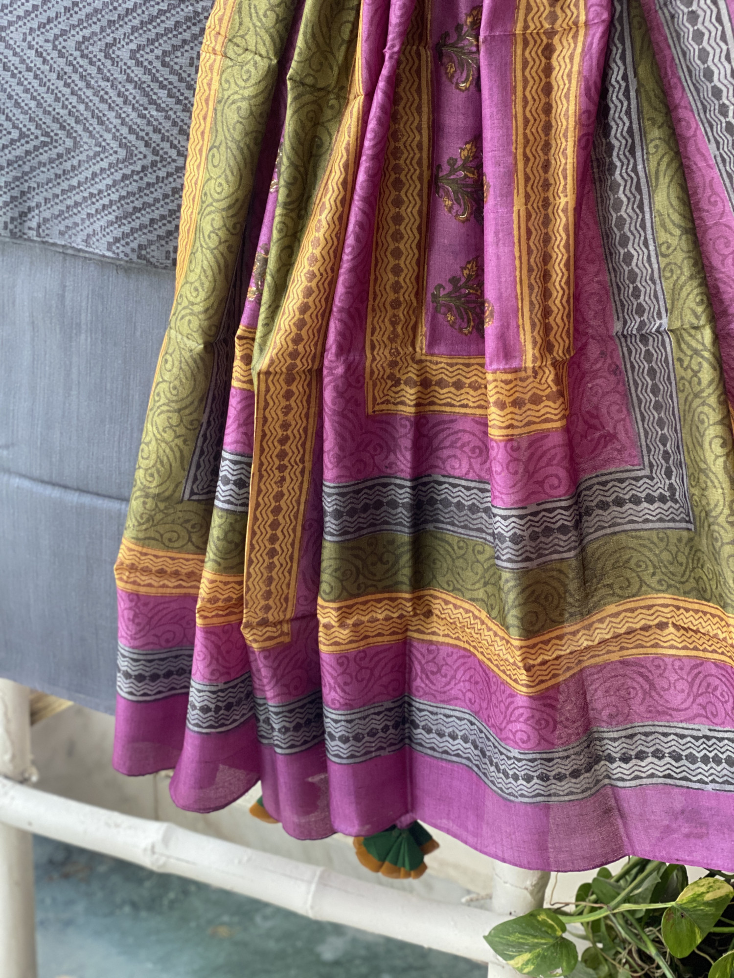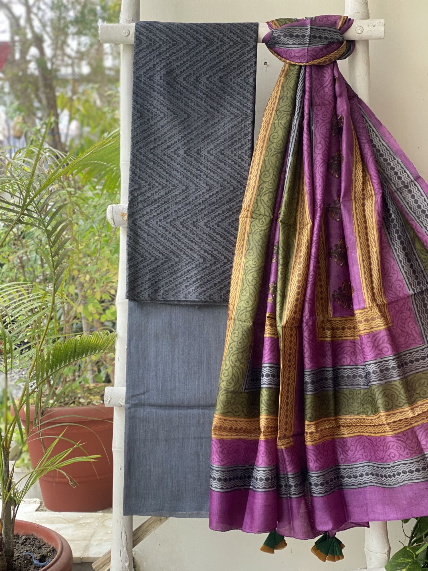 CHARCOAL WOVEN SILK PRINTED SHIRT AND CHARCOAL WOVEN SILK PLAIN BOTTOM PAIRED WITH A MULTI COLOUR TUSSAR SILK PRINTED DUPATTA . ACCESSORISED WITH TASSELS