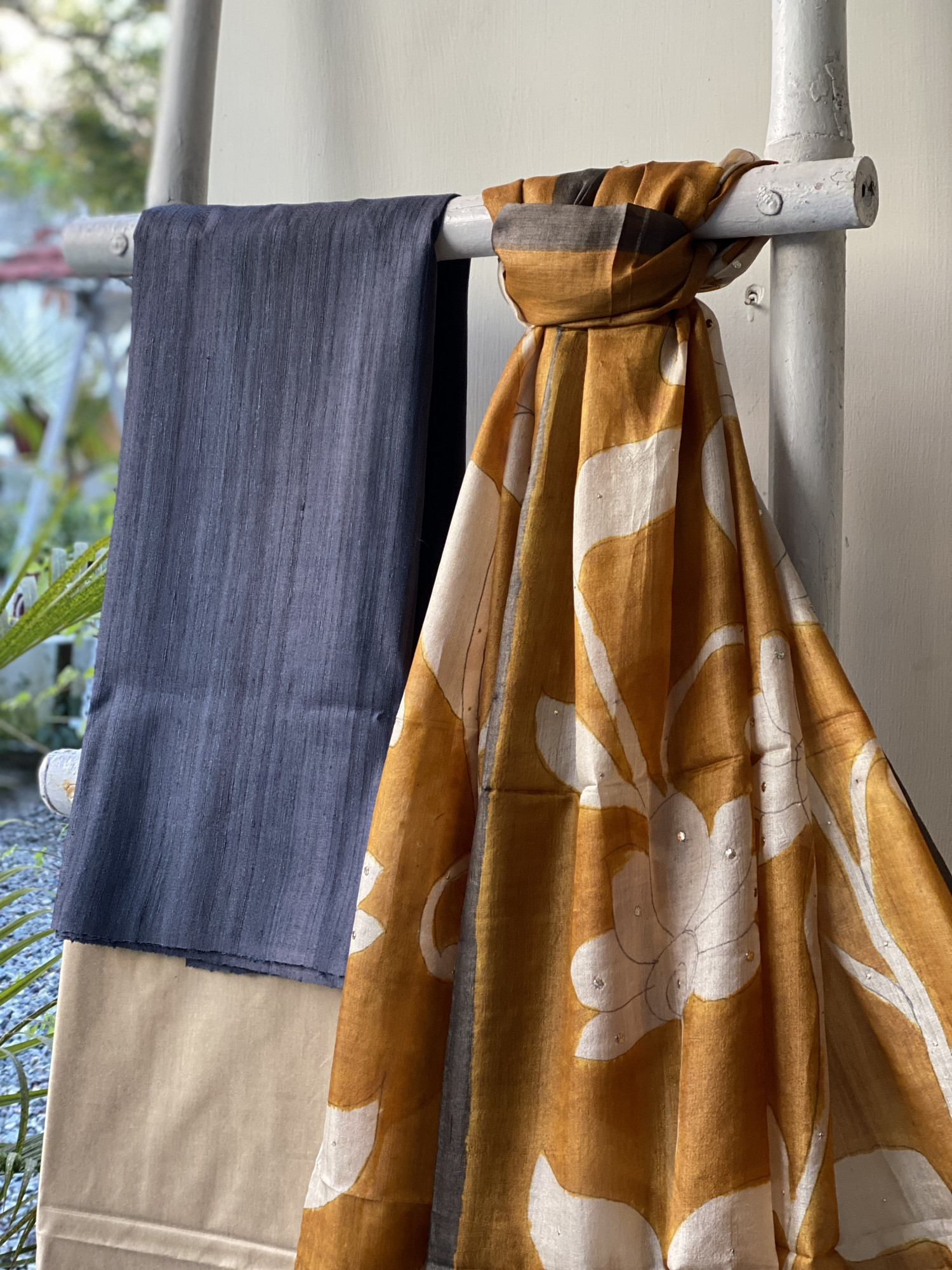 CHARCOAL BLACK TUSSAR SILK SHIRT WITH BEIGE HANDLOOM SILK BOTTOM PAIRED WITH A MUSTARD HAND PAINTED TUSSAR SILK WOVEN DUPATTA . ACCESSORISED WITH TASSELS