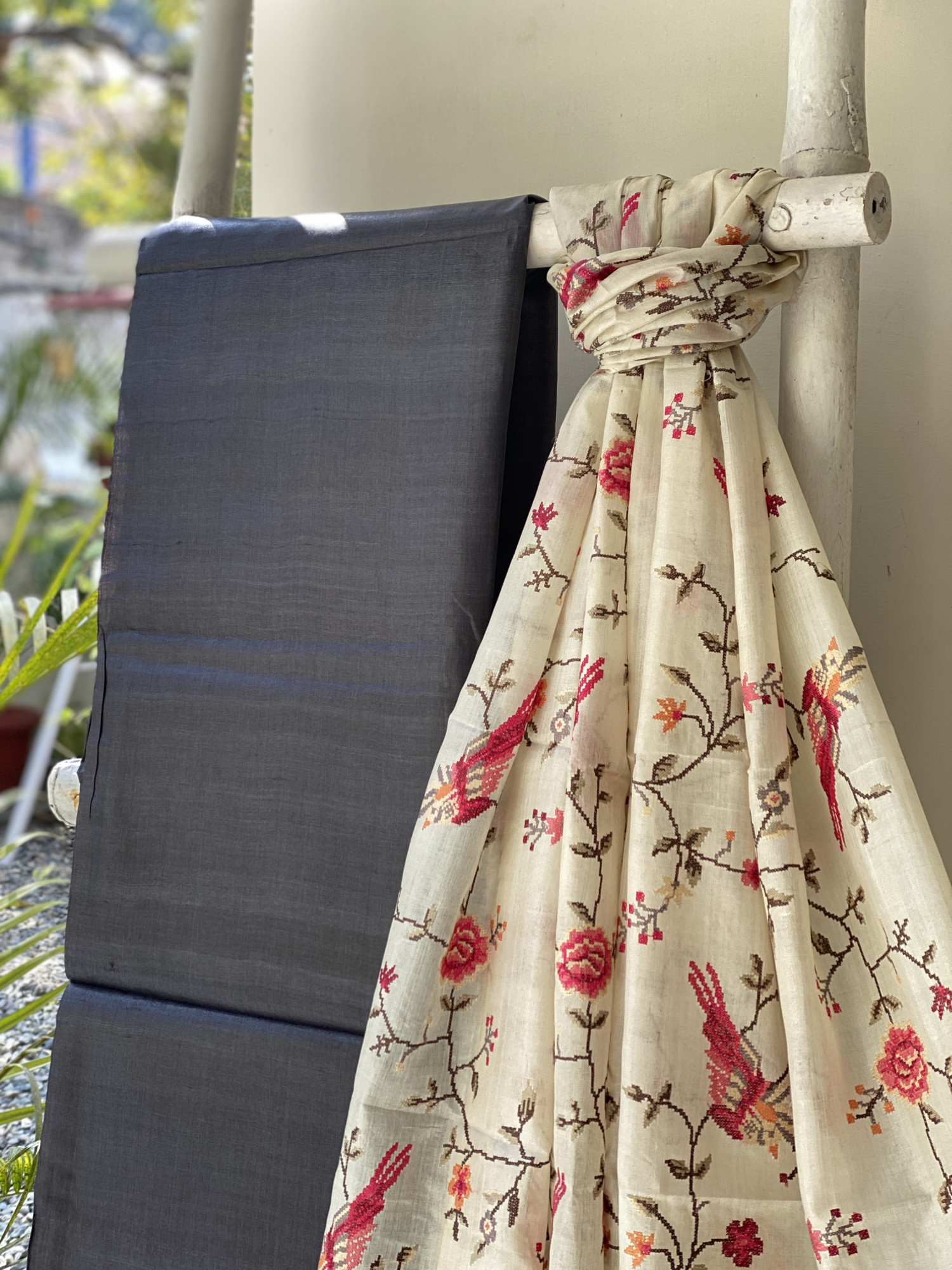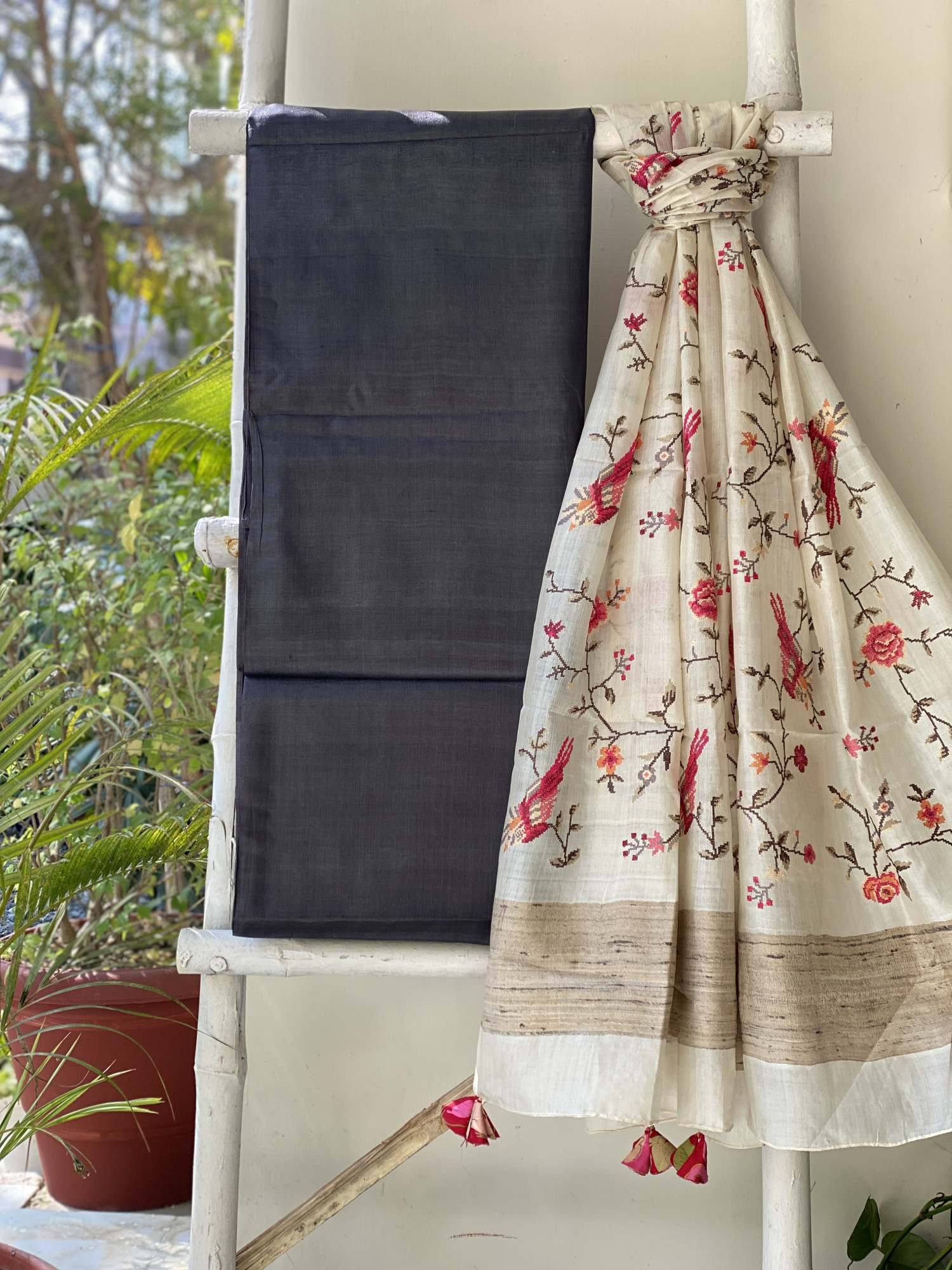 CHARCOAL BLACK TUSSAR SILK SHIRT AND BOTTOM PAIRED WITH AN OFF WHITE TUSSAR SILK EMBROIDERED DUPATTA WITH GICHA BORDER. ACCESSORISED WITH TASSELS