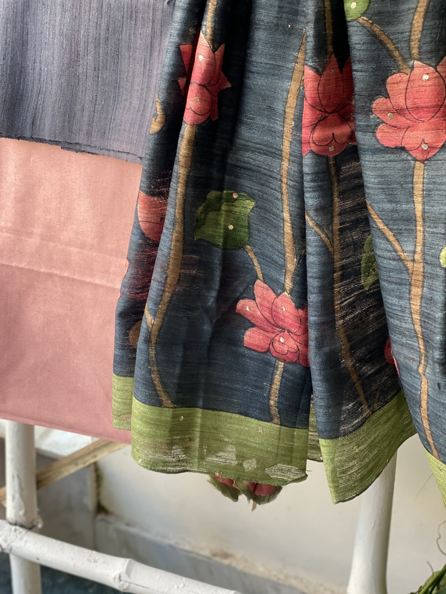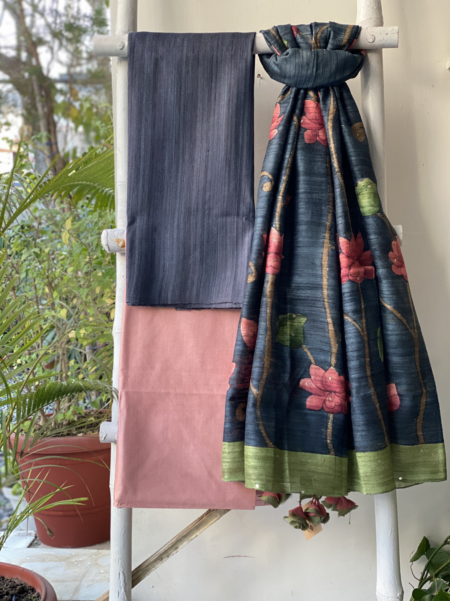 CHARCOAL BLACK TUSSAR SILK SHIRT WITH PINK HANDLOOM SILK BOTTOM PAIRED WITH A CHARCOAL HAND PAINTED TUSSAR SILK WOVEN DUPATTA . ACCESSORISED WITH TASSELS