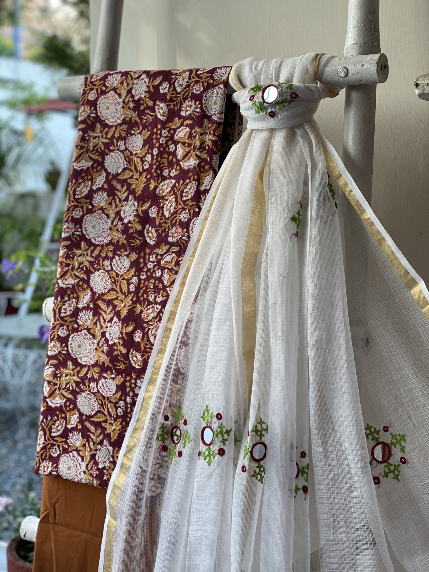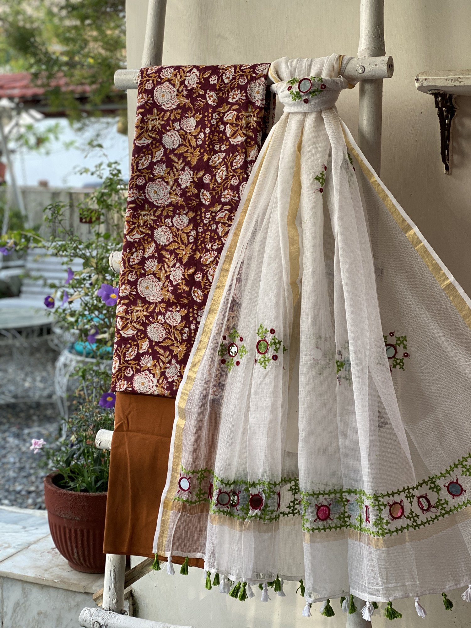 CHERRY HAND BLOCK PRINT COTTON SHIRT AND A MUSTARD PLAIN COTTON BOTTOM PAIRED WITH AN OFF WHITE KOTA HAND EMBROIDERED DUPATTA WITH ZARI WOVEN BORDER, ACCESSORISED WITH TASSLES.