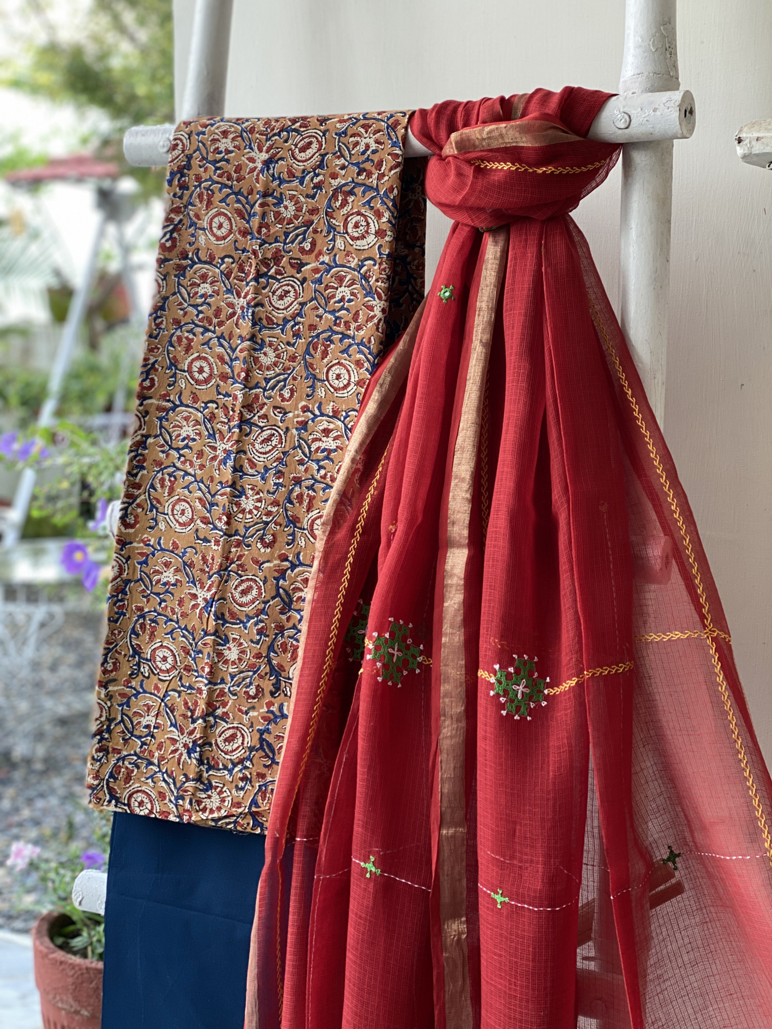 FAWN HAND BLOCK PRINT COTTON SHIRT AND A NAVY BLUE PLAIN COTTON BOTTOM PAIRED WITH A RED KOTA HAND EMBROIDERED DUPATTA WITH ZARI WOVEN BORDER, ACCESSORISED WITH TASSLES.