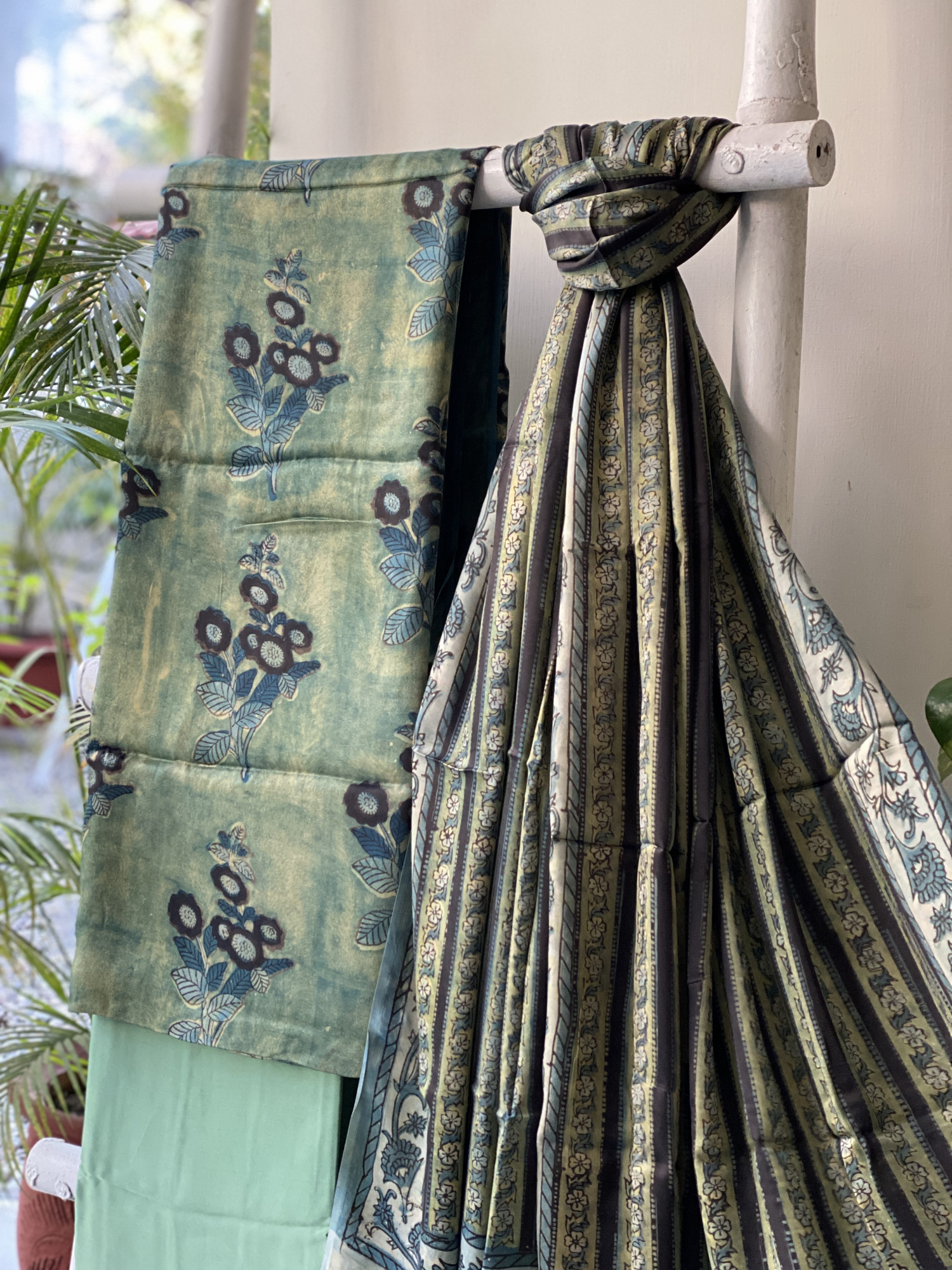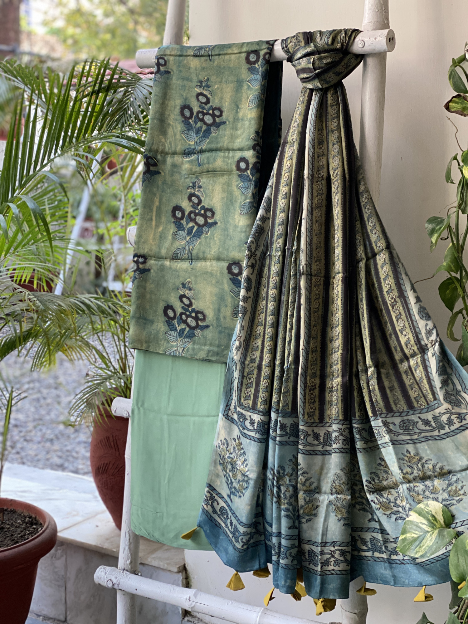 GREEN hand dyed ajrakh block print modal silk shirt and GREEN MODAL SILK PLAIN BOTTOM paired with A GREEN modal silk ajrakh block print dupatta, accessorised with tassles.