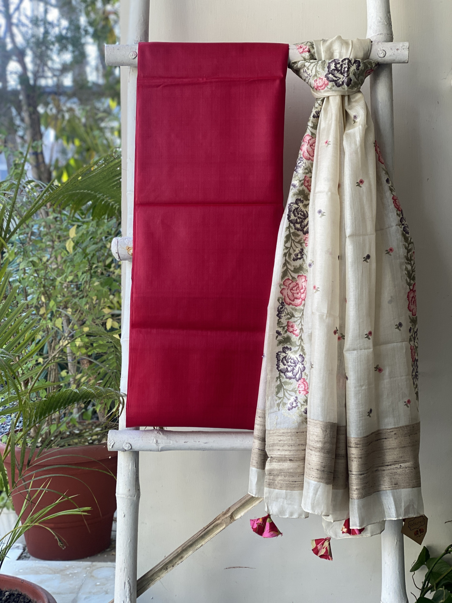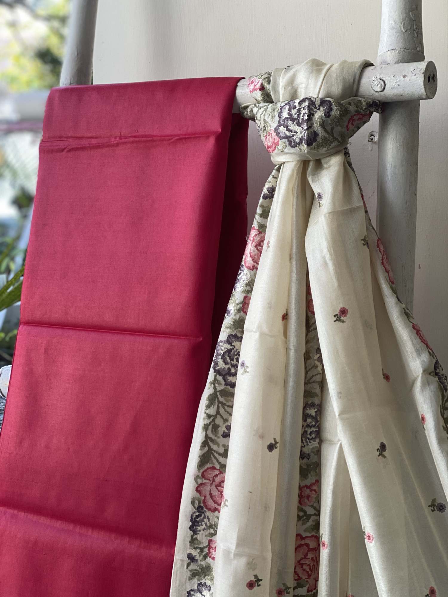 ROSE TUSSAR SILK SHIRT AND BOTTOM PAIRED WITH AN OFF WHITE TUSSAR SILK EMBROIDERED DUPATTA WITH GICHA BORDER. ACCESSORISED WITH TASSELS