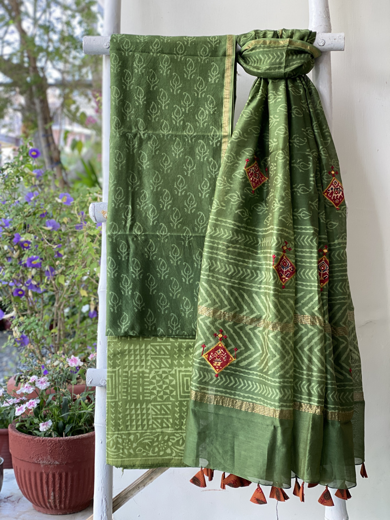 GREEN CHANDERI COTTON BLOCK PRINT EMBROIDERED DUPATTA SET