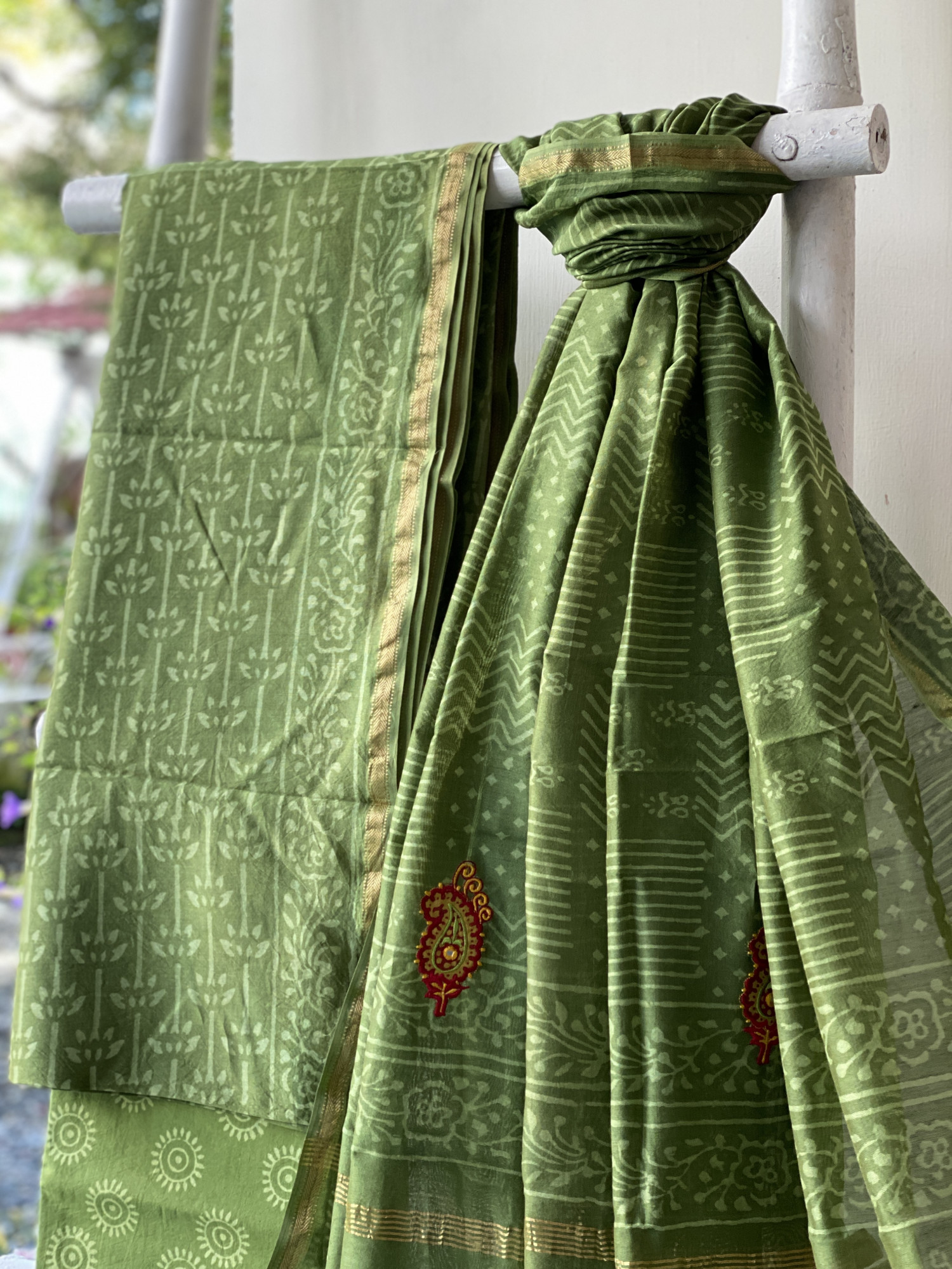 GREEN CHANDERI COTTON BLOCK PRINT EMBROIDERED DUPATTA SET