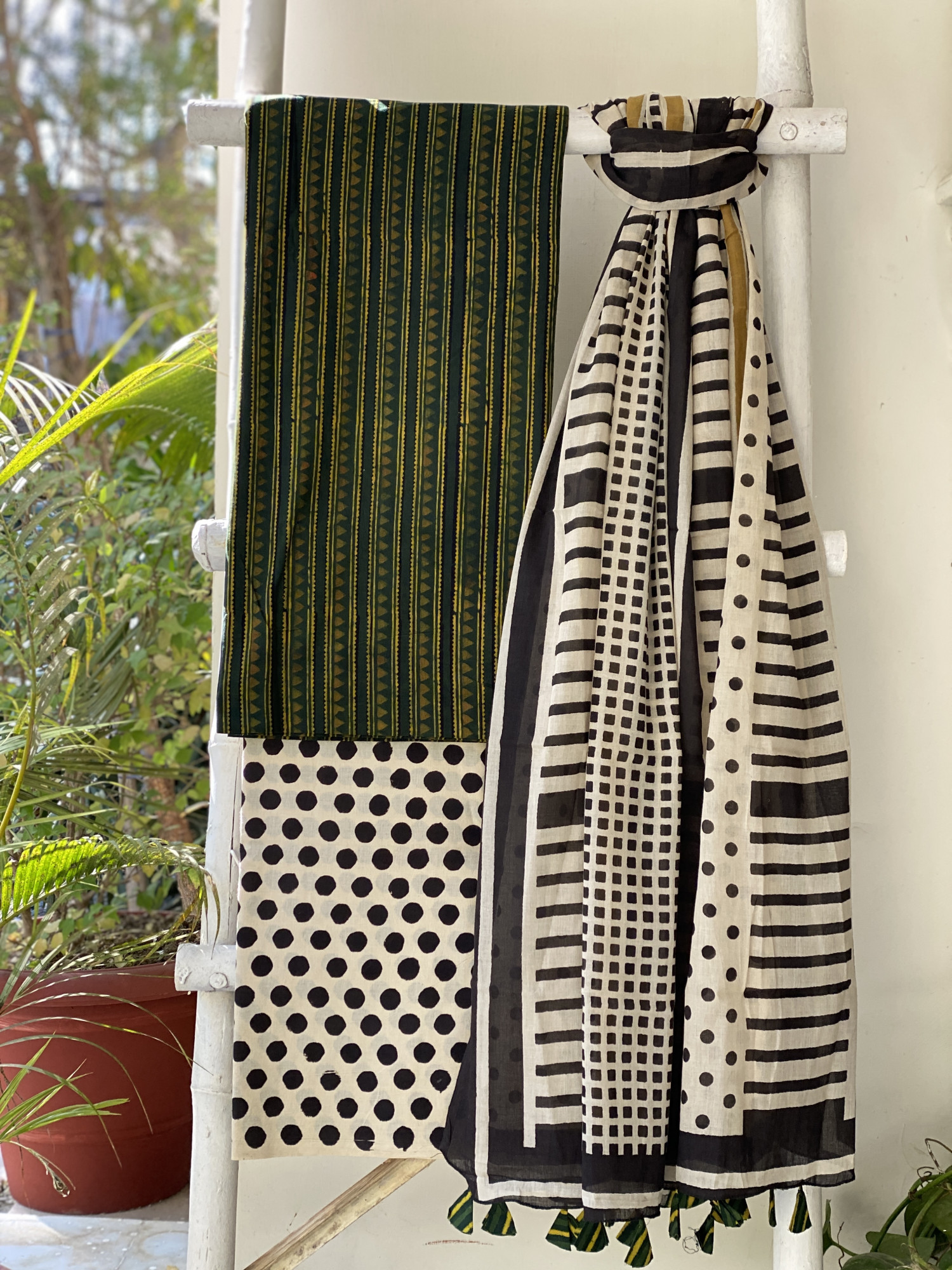 GREEN AJRAKH HAND BLOCK PRINT MUL COTTON SHIRT AND A OFF-WHITE POLKA DOTS BLOCK PRINT MUL COTTON BOTTOM, PAIRED WITH A OFF-WHITE GEOMETRIC PATTERN MUL COTTON BLOCK PRINT DUPATTA, ACCESSORISED WITH TASSLES.