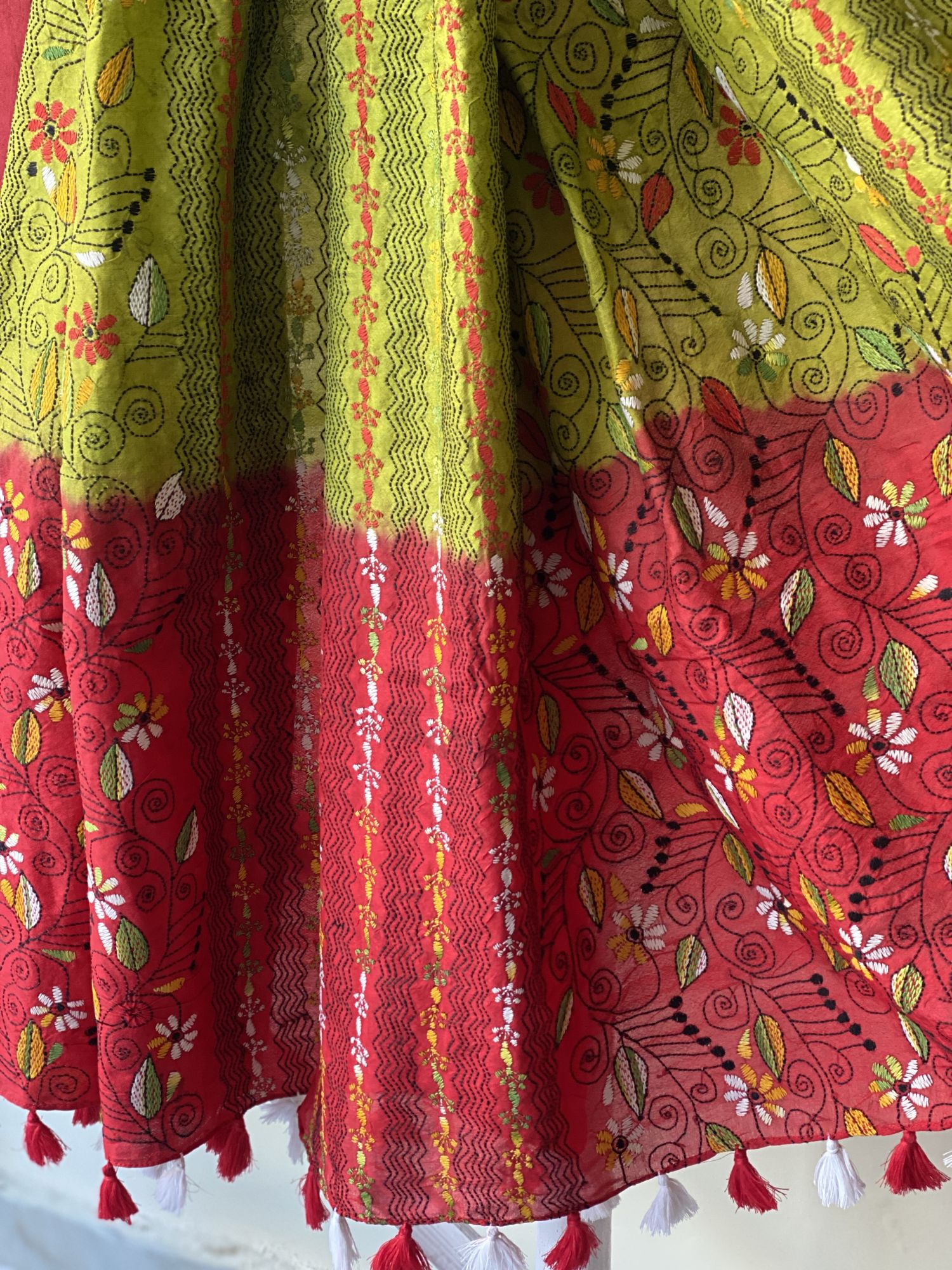 RED MASHRU silk shirt AND GREEN COTTON TUSSAR BOTTOM paired with A RED-GREEN KANTHA HAND EMBROIDERED SILK dupatta AND accessorised with tassles.