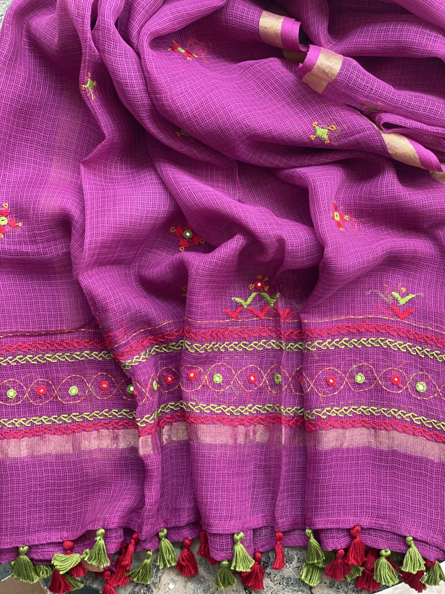 GREEN HAND BLOCK PRINT COTTON SHIRT AND A WINE PLAIN COTTON BOTTOM PAIRED WITH A WINE KOTA HAND EMBROIDERED DUPATTA WITH ZARI WOVEN BORDER, ACCESSORISED WITH TASSLES.