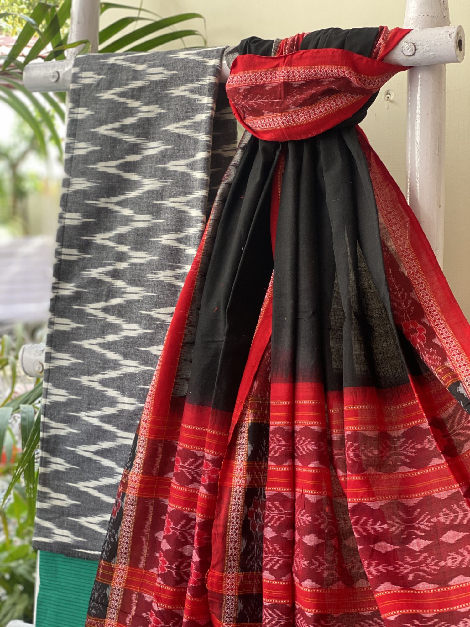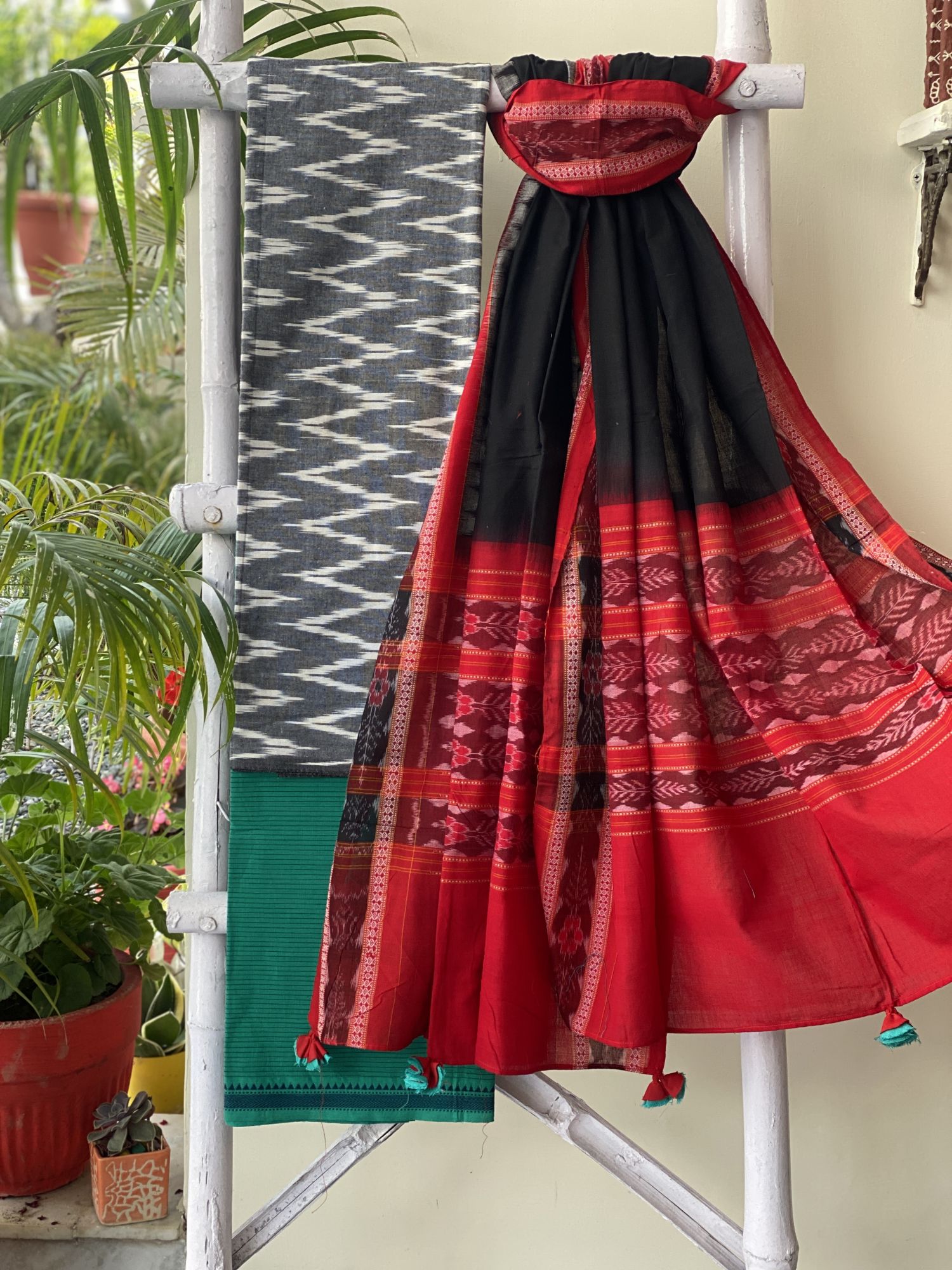 GREY cotton woven ikkat SHIRT with TEAL STRIPED south cotton BOTTOM paired with a BLACK-RED cotton woven SAMBALPURI IKKAT dupatta.