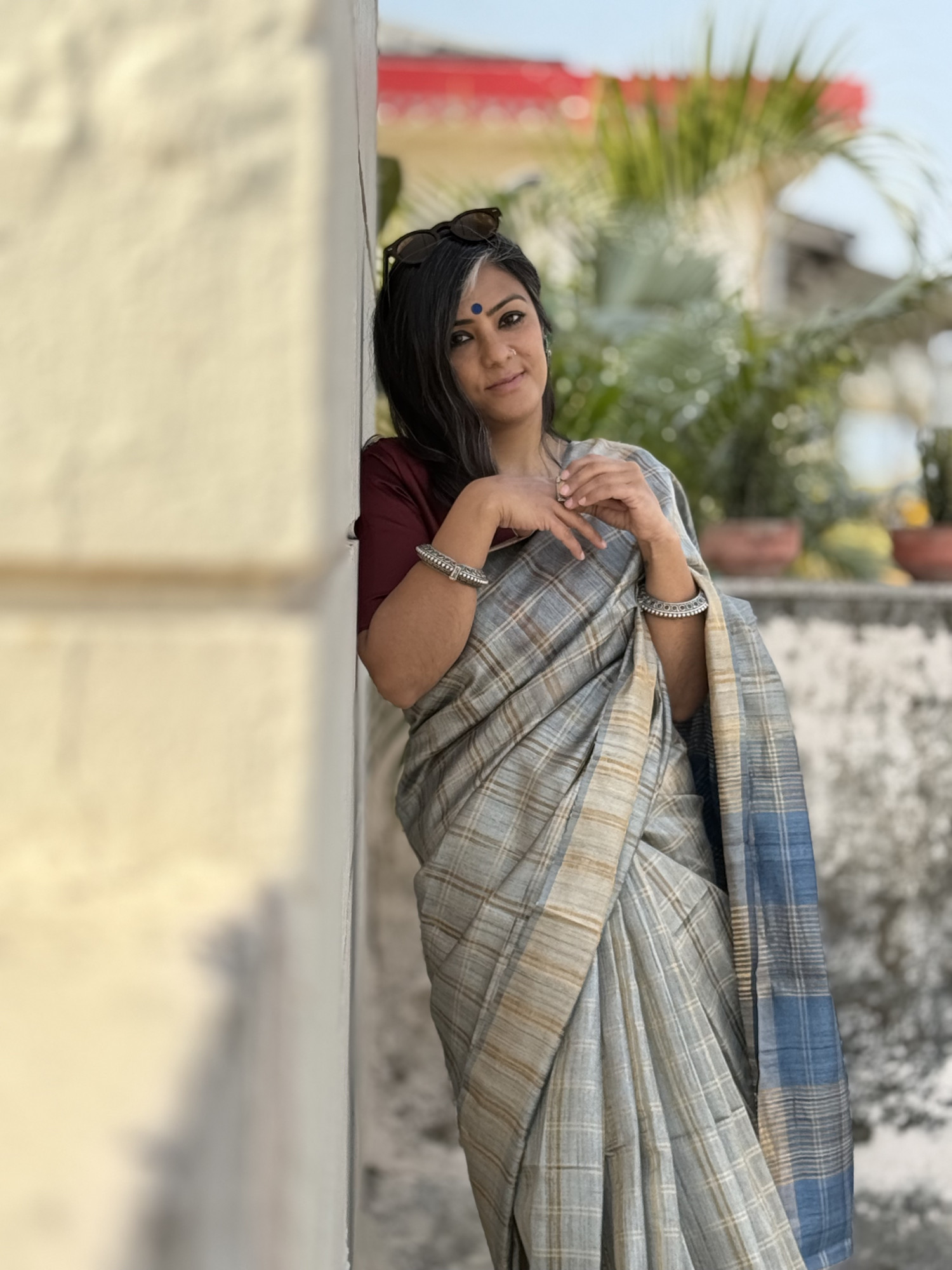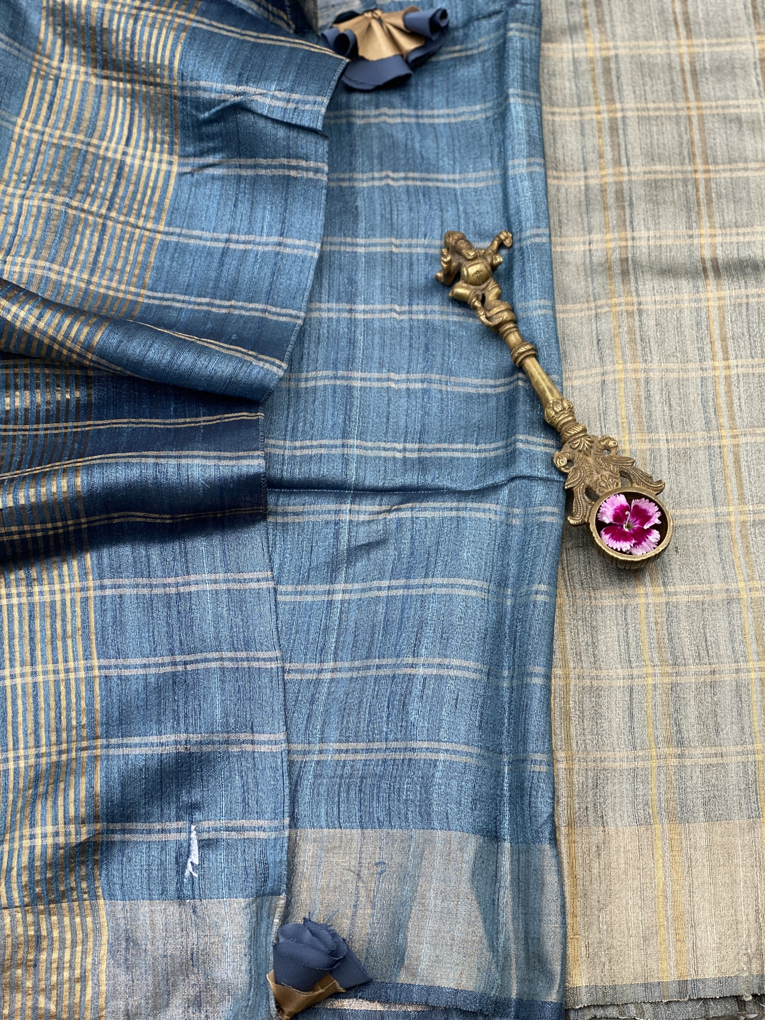 GREY-BLUE ZAR CHECKERED HAND WOVEN TUSSAR SILK SARI WITH ZARI WOVEN BORDER AND BLUE ZARI WOVEN PALLA, ACCESSORISED WITH TASSLES.