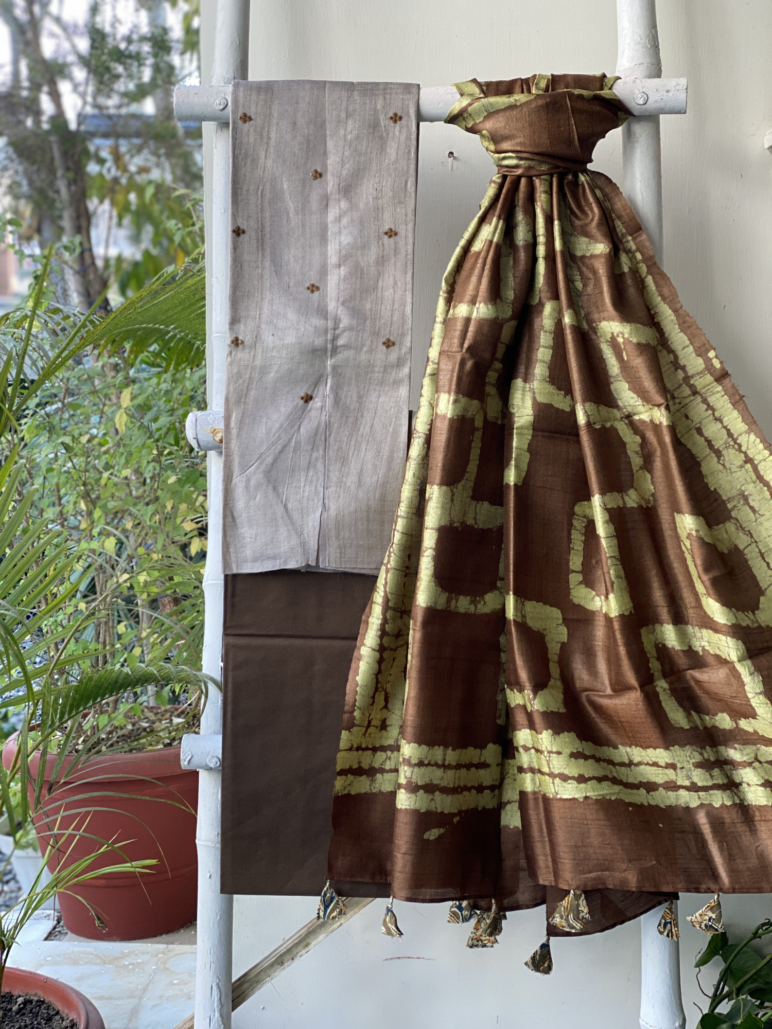 GREY TUSSAR SILK SHIRT WITH EMBROIDERRY AND BROWN HANDLOOM SILK BOTTOM PAIRED WITH A BROWN TUSSAR SILK BATIK DUPATTA . ACCESSORISED WITH TASSELS