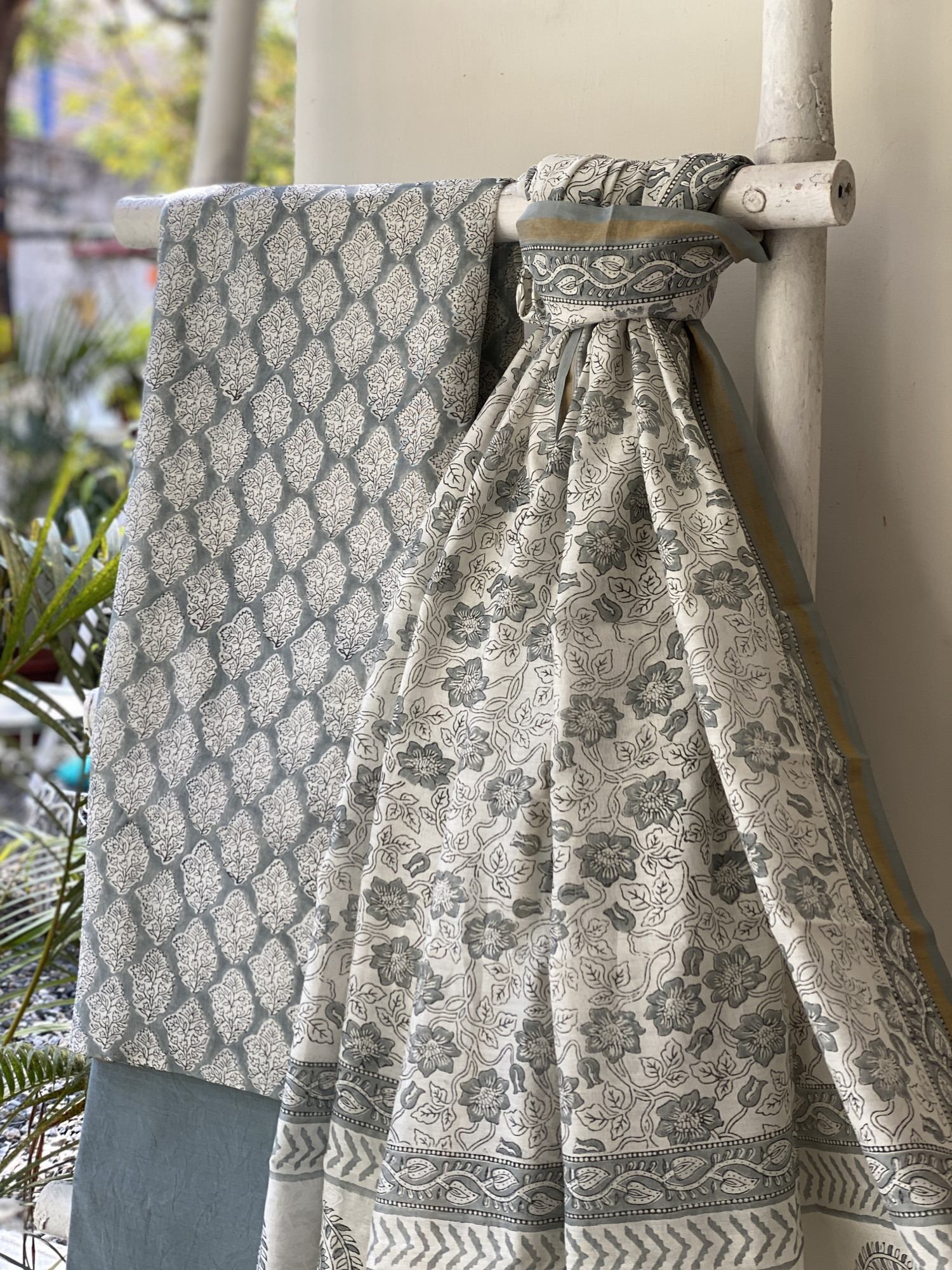 GREY CHANDERI HAND BLOCK PRINTED SILK & COTTON ZARI WOVEN BORDER SHIRT WITH A GREY PLAIN COTTON MULL BOTTOM PAIRED WITH AN OFF WHITE HAND BLOCK PRINT CHANDERI ZARI WOVEN BORDER DUPATTA, ACCESSORISED WITH TASSLES.