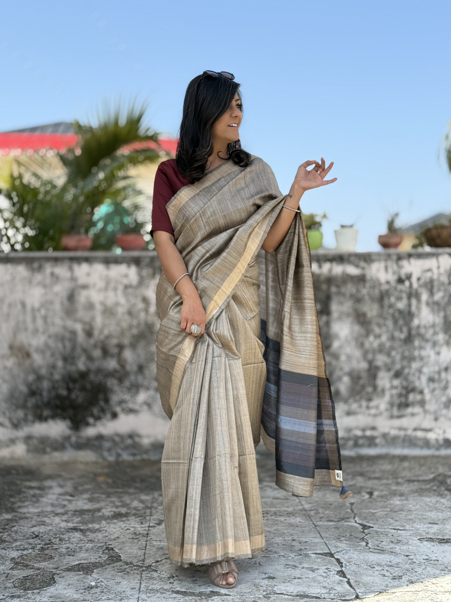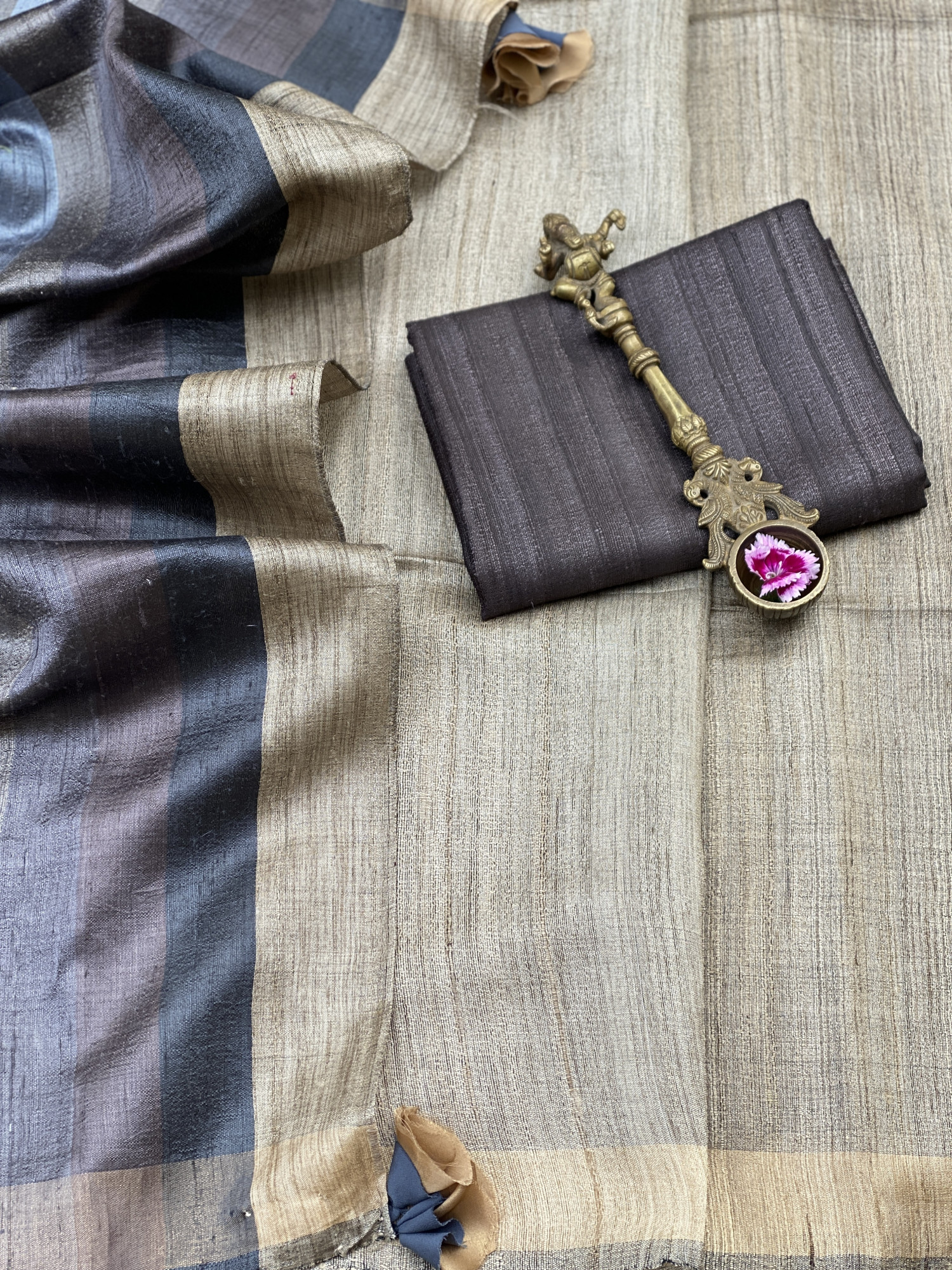 COMES WITH ITS OWN GREY BLOUSE AND AN EXTRA COFFEE BROWN GICHA TUSSAR SILK BLOUSE PIECE (90 CMS)