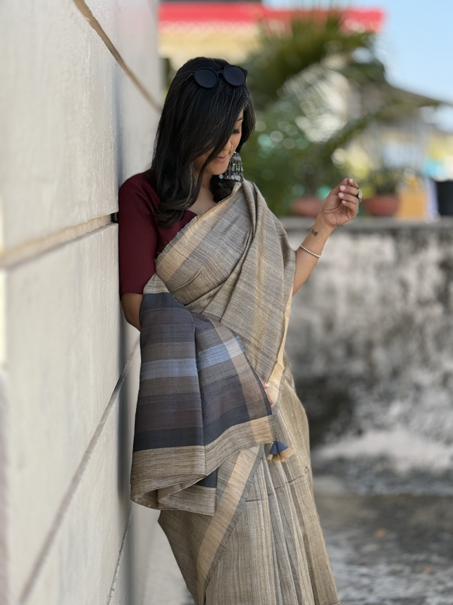 GREY HAND WOVEN TUSSAR SILK SARI WITH ZARI WOVEN BORDER AND MULTI COLOUR STRIPED PALLA, ACCESSORISED WITH TASSLES.