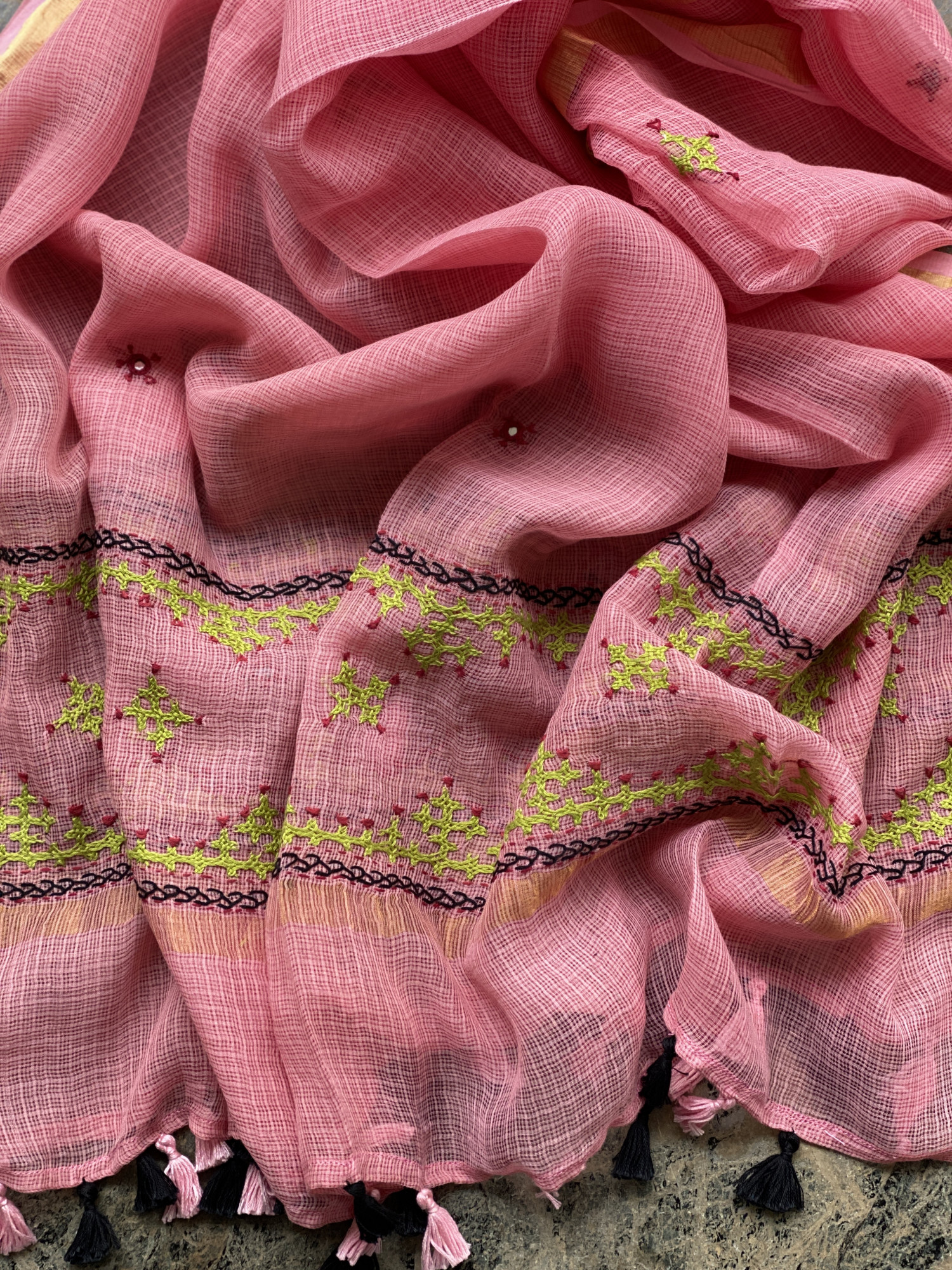 GREY HAND BLOCK PRINT COTTON SHIRT AND A PEACH PLAIN WOVEN COTTON BOTTOM PAIRED WITH A PEACH KOTA HAND EMBROIDERED DUPATTA WITH ZARI WOVEN BORDER, ACCESSORISED WITH TASSLES.