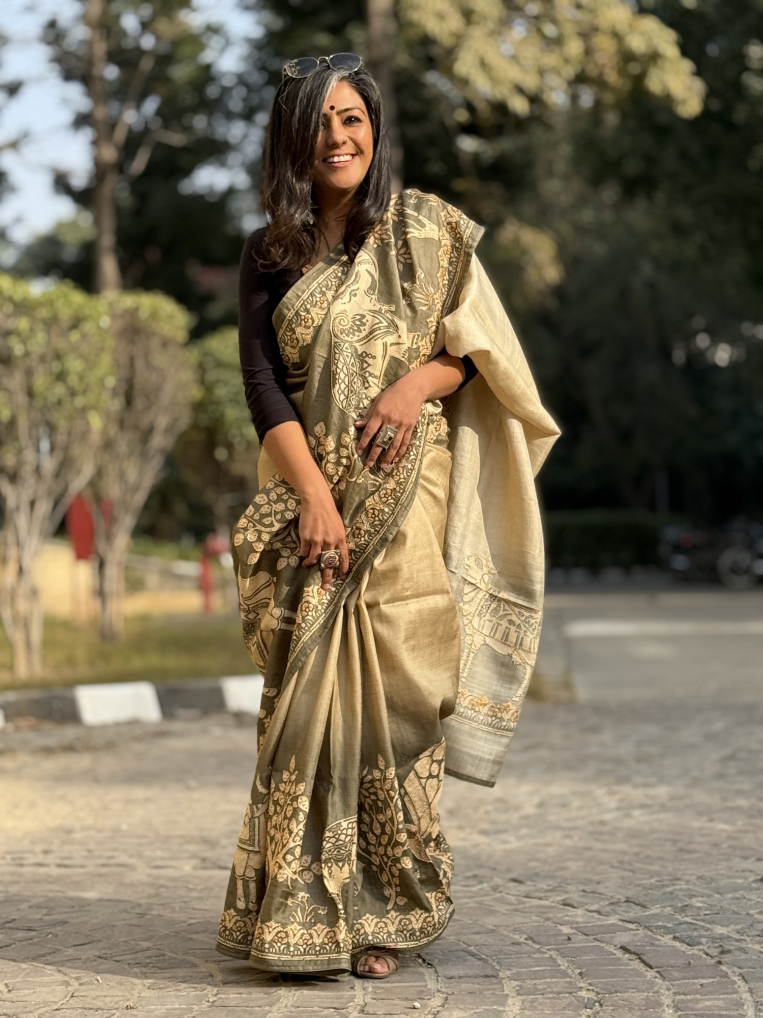 COMES WITH ITS OWN GREY TUSSAR SILK BLOUSE AND AN EXTRA BLACK COTTON TUSSAR BLOUSE PIECE (90 CMS)