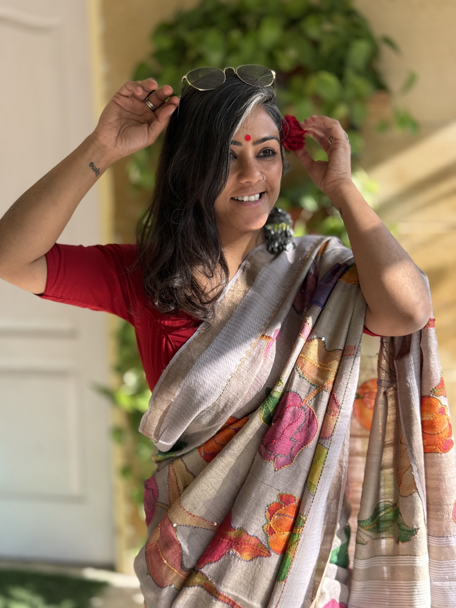 COMES WITH ITS OWN GREY TUSSAR KANTHA EMBROIDERED BLOUSE AND AN EXTRA ROSE GICHA TUSSAR SILK BLOUSE PIECE (90 CMS)