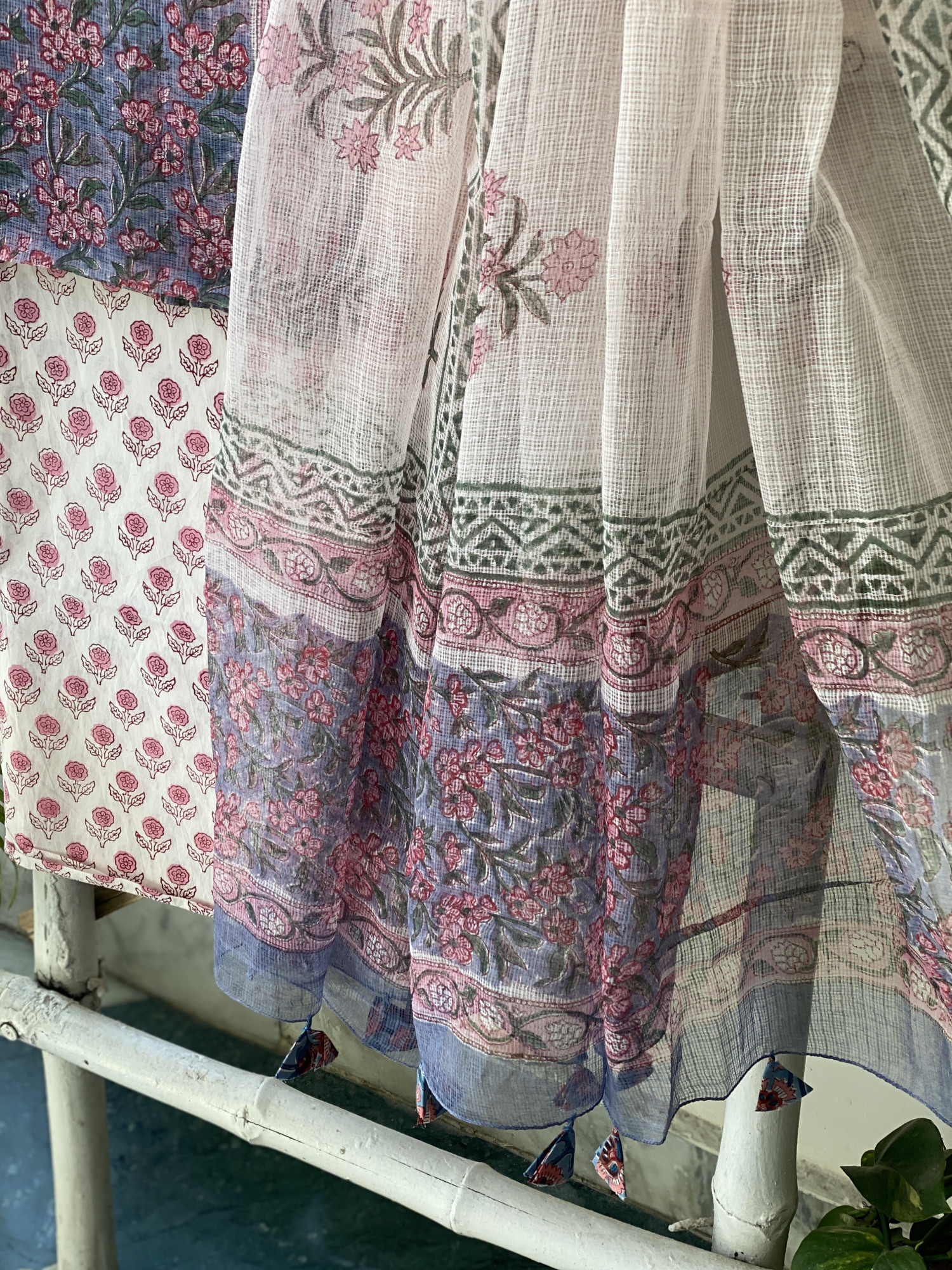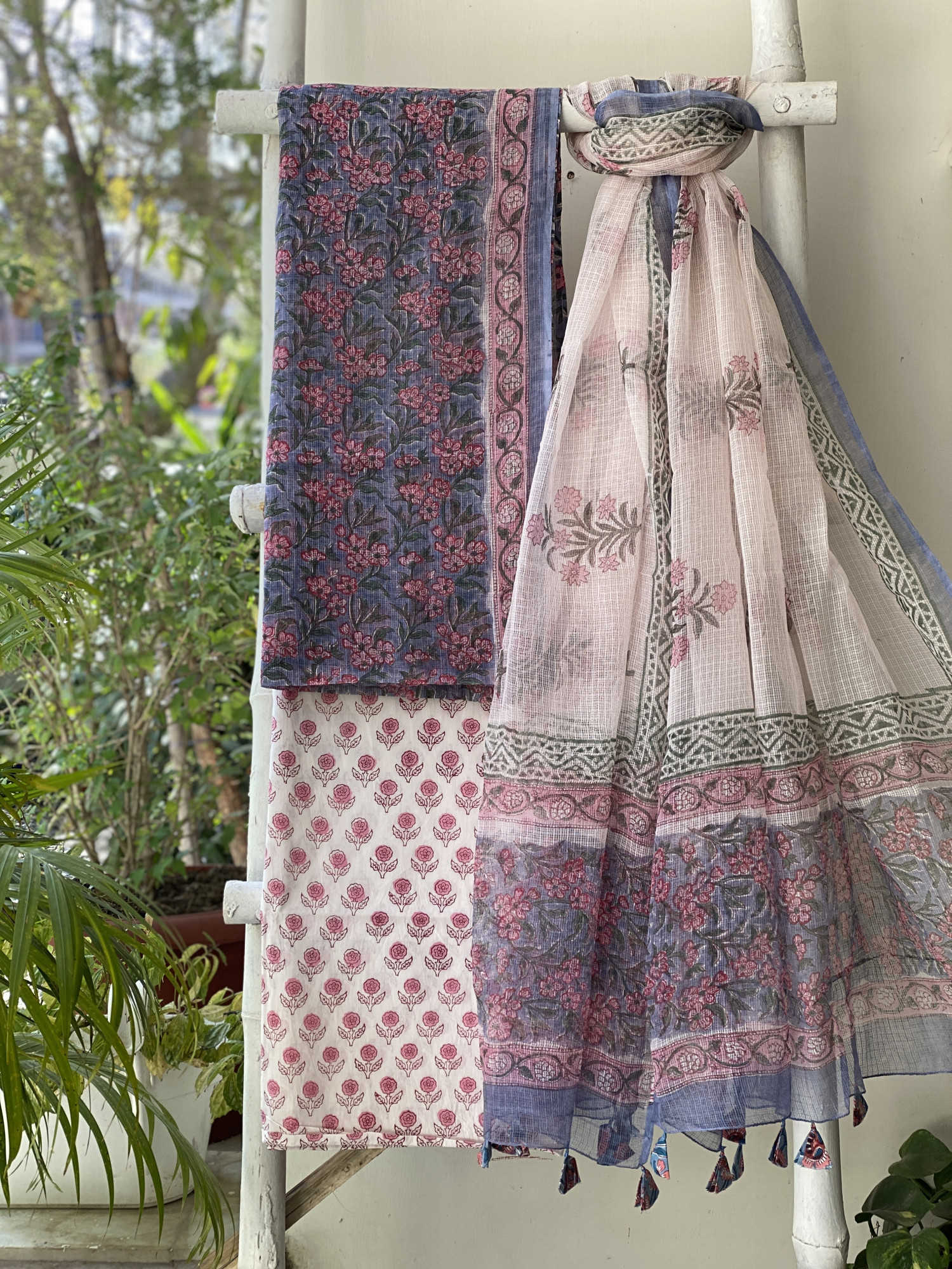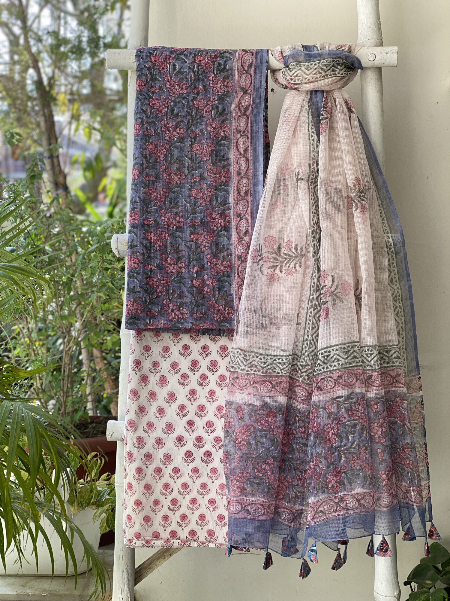 GREYISH-BLUE HAND BLOCK PRINT KOTA SHIRT (COMES WITH A MATCHING COTTON LINING PIECE) AND AN OFF WHITE COTTON BLOCK PRINT BOTTOM PAIRED WITH AN OFF WHITE KOTA BLOCK PRINT DUPATTA, ACCESSORISED WITH TASSLES.