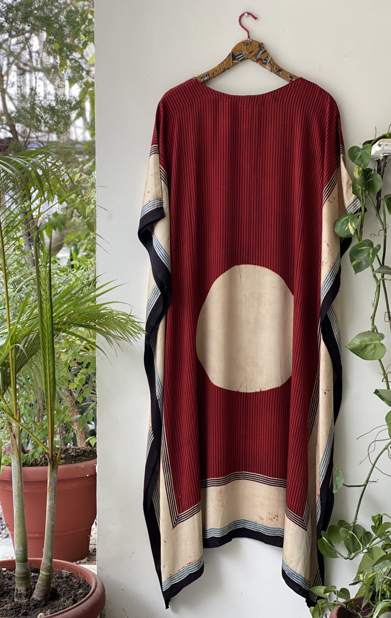 MAROON AJRAKH HAND BLOCK PINTED MODAL SILK V-NECK KAFTAN .