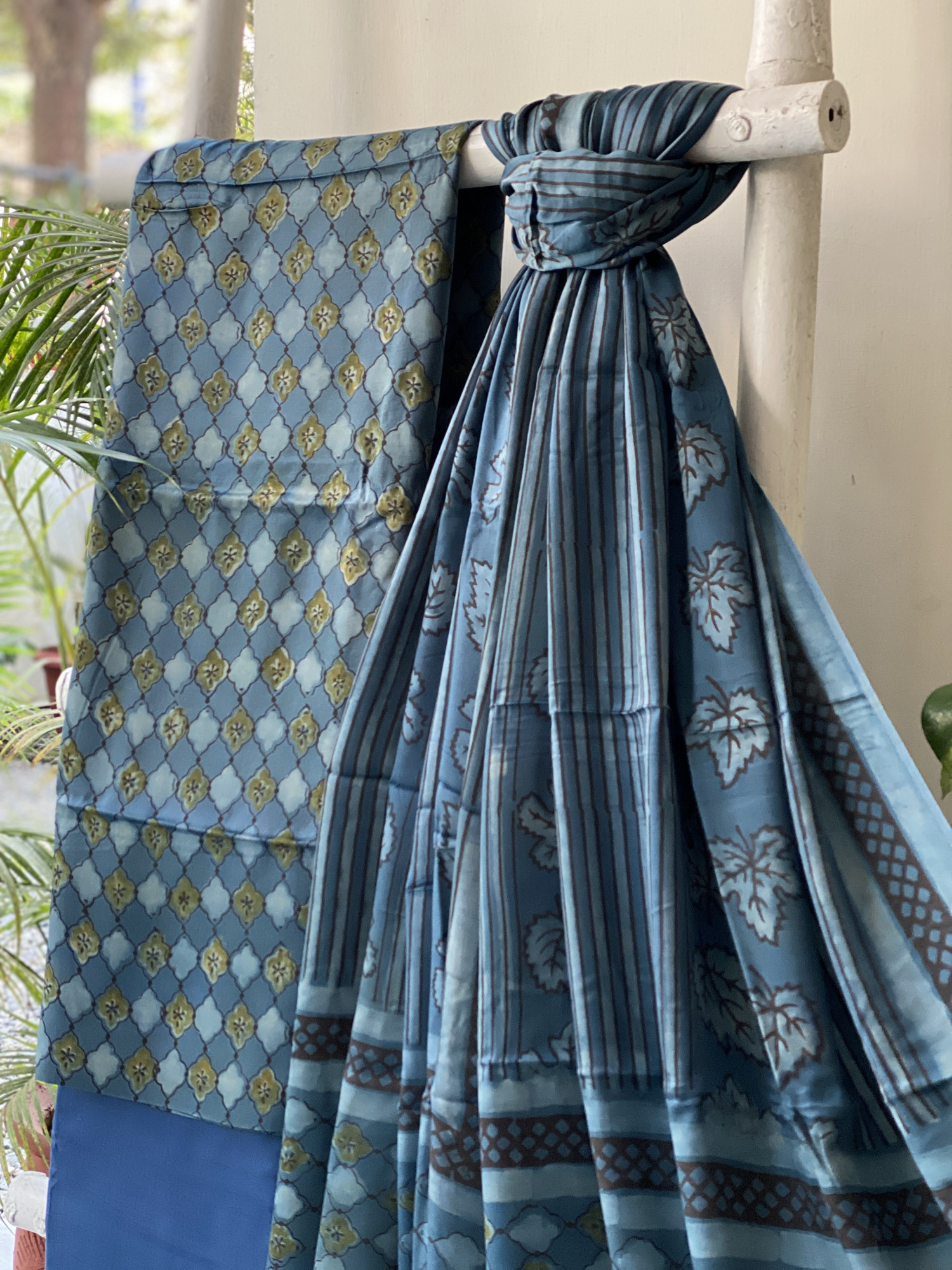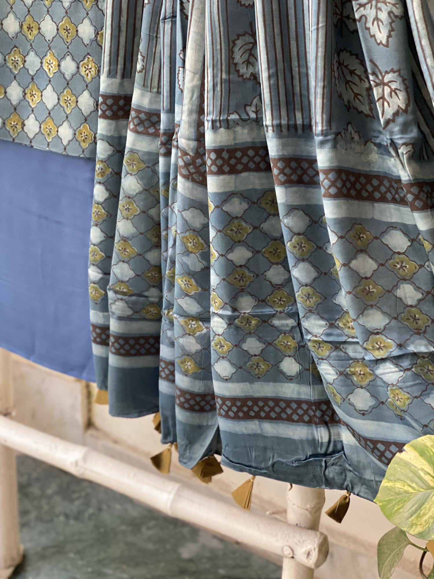 INDIGO hand dyed ajrakh block print modal silk shirt and INDIGO MODAL SILK PLAIN BOTTOM paired with A INDIGO modal silk ajrakh block print dupatta, accessorised with tassles.