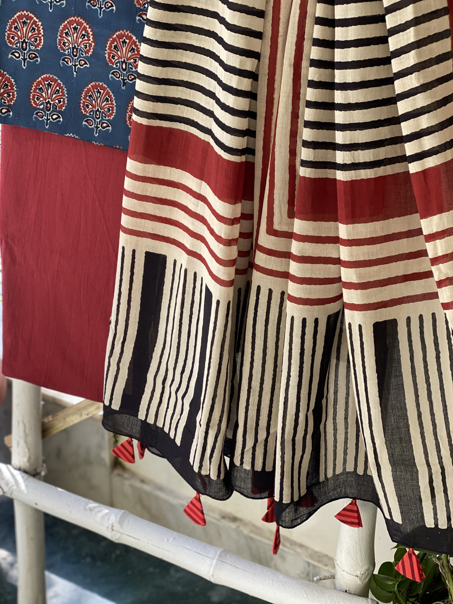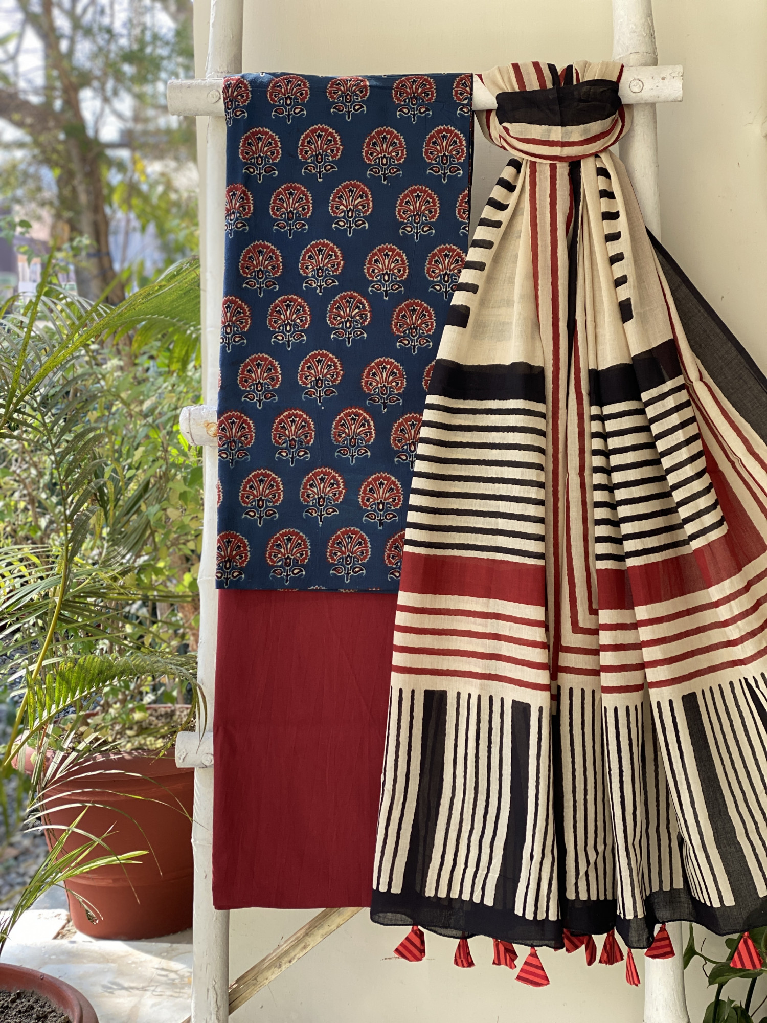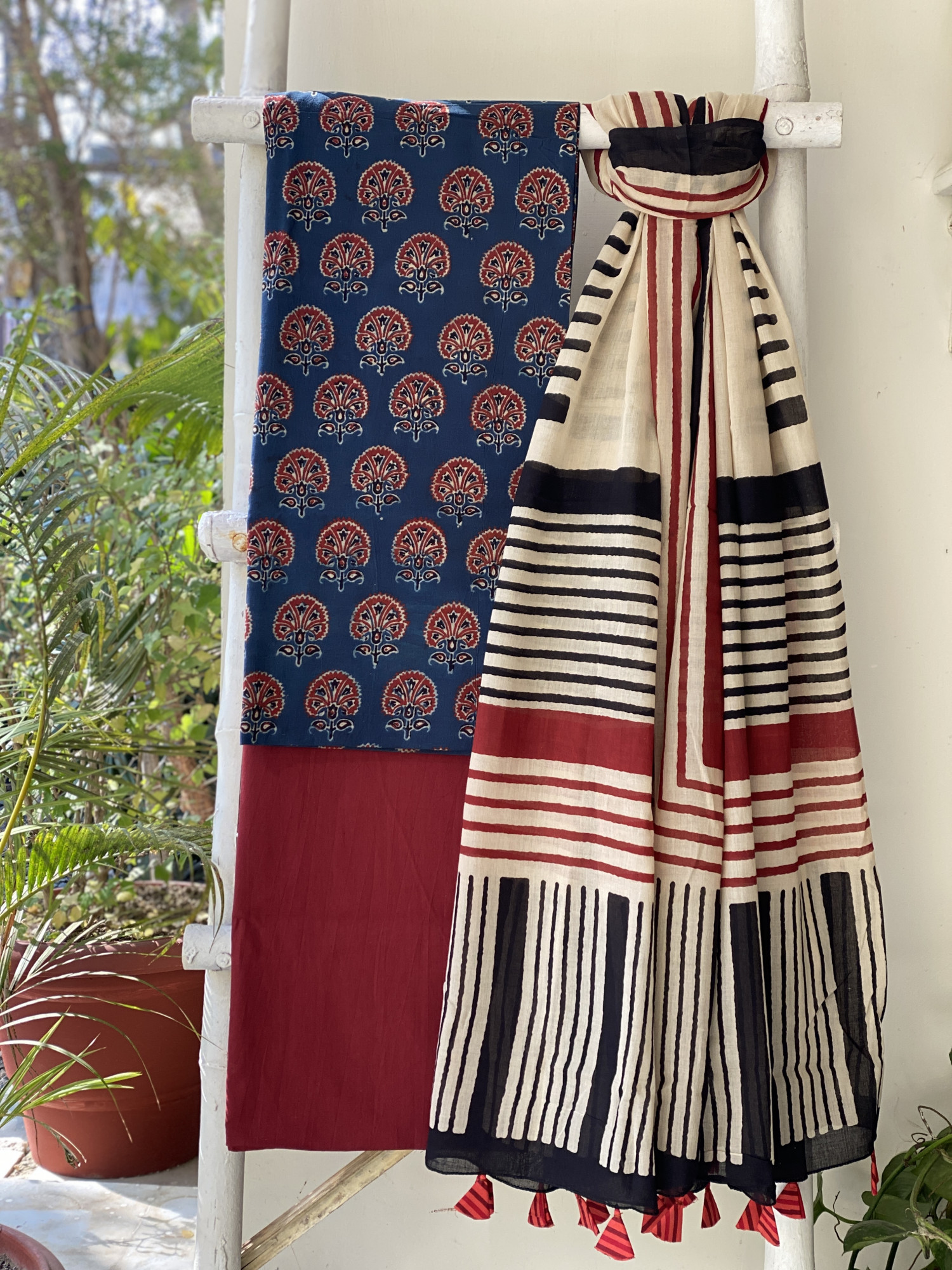 INDIGO AJRAKH HAND BLOCK PRINT MUL COTTON SHIRT AND A MAROON PLAIN MUL COTTON BOTTOM, PAIRED WITH A BEIGE GEOMETRIC PATTERN MUL COTTON BLOCK PRINT DUPATTA,  ACCESSORISED WITH TASSLES.