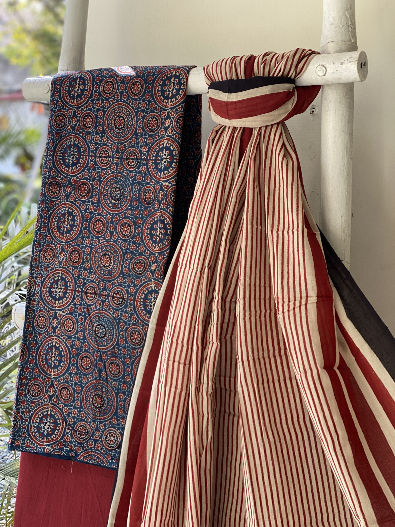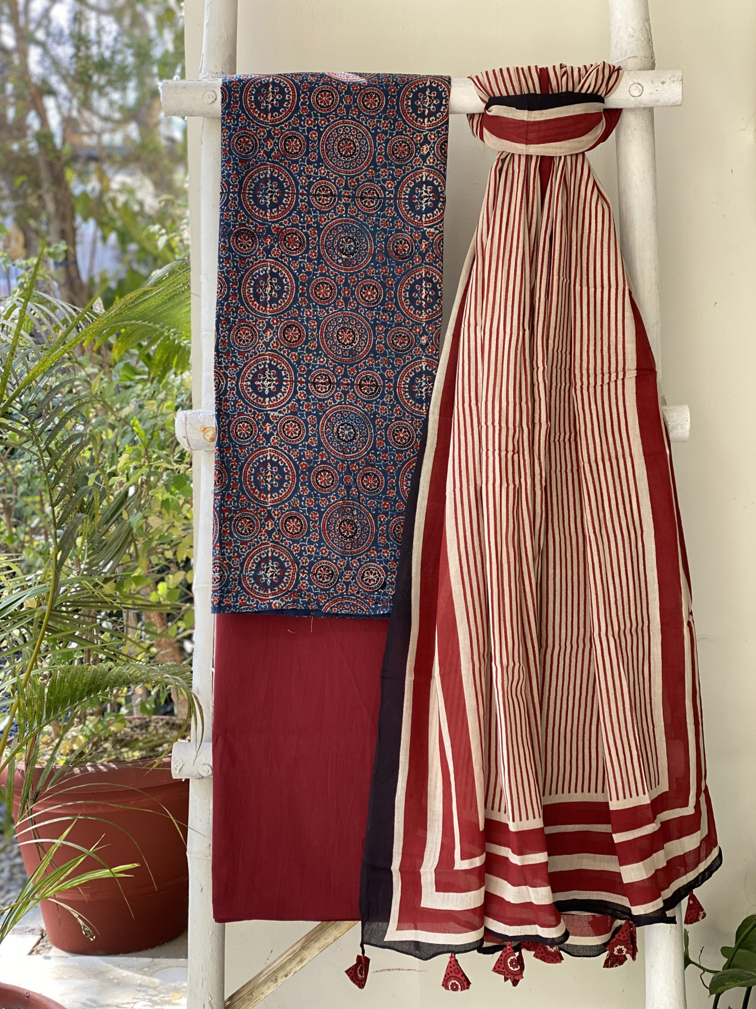 INDIGO AJRAKH HAND BLOCK PRINT MUL COTTON SHIRT AND A MAROON PLAIN MUL COTTON BOTTOM, PAIRED WITH A BEIGE GEOMETRIC PATTERN MUL COTTON BLOCK PRINT DUPATTA, ACCESSORISED WITH TASSLES.