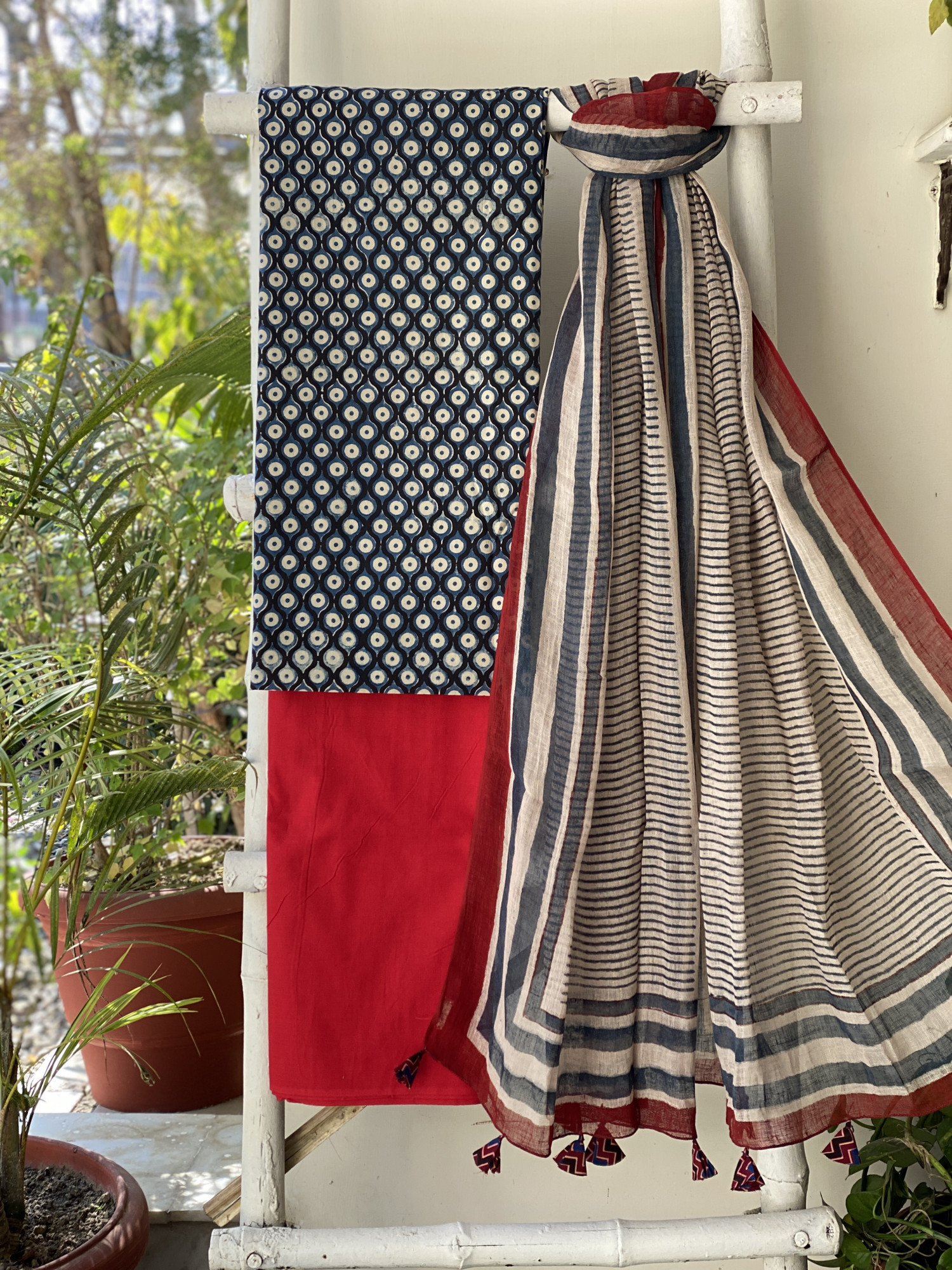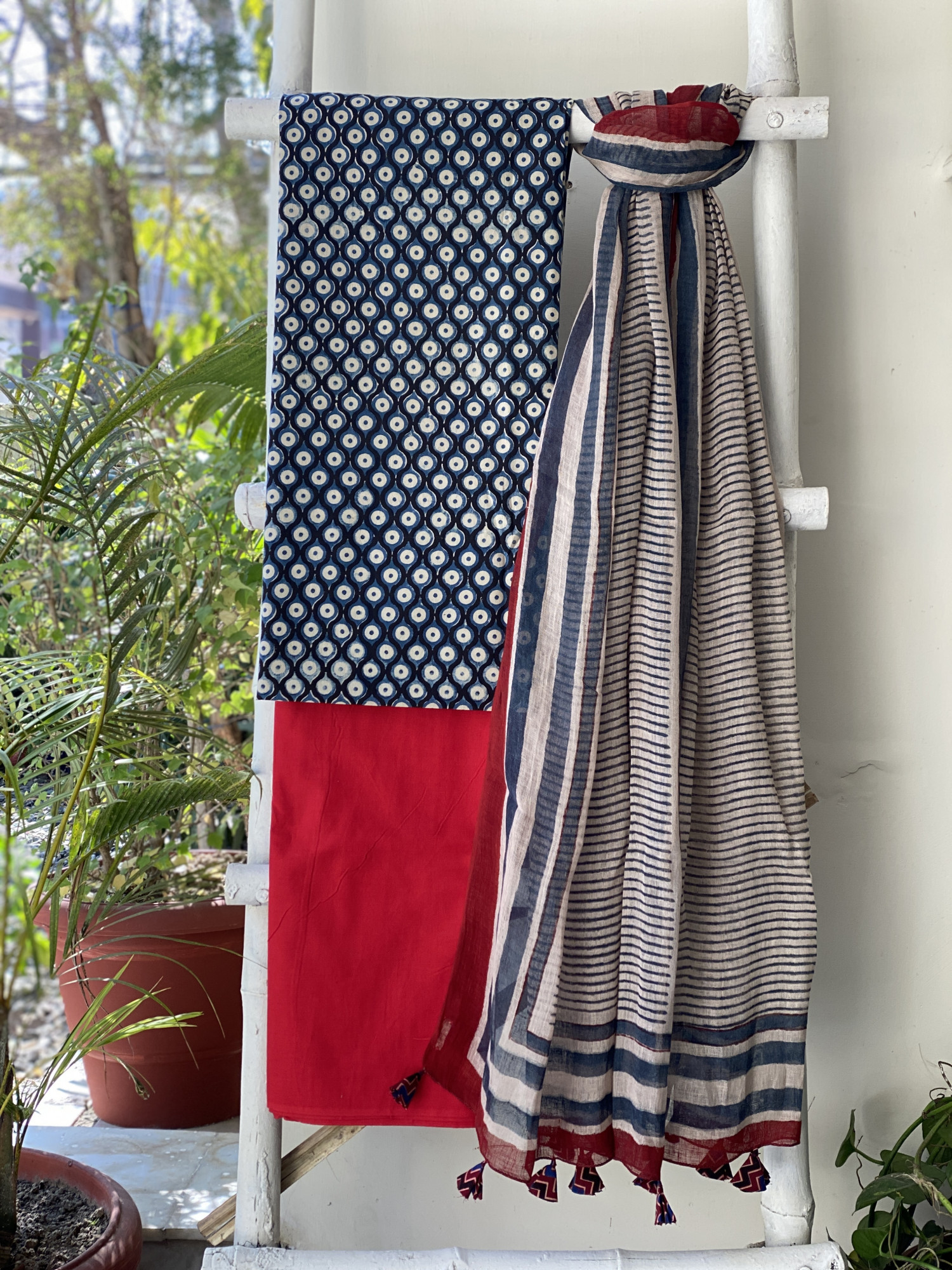 INDIGO HAND BLOCK PRINT COTTON SHIRT AND A RED PLAIN WOVEN COTTON BOTTOM, PAIRED WITH A BEIGE GEOMETRIC PATTERN HAND BLOCK PRINTED COTTON LINEN DUPATTA.