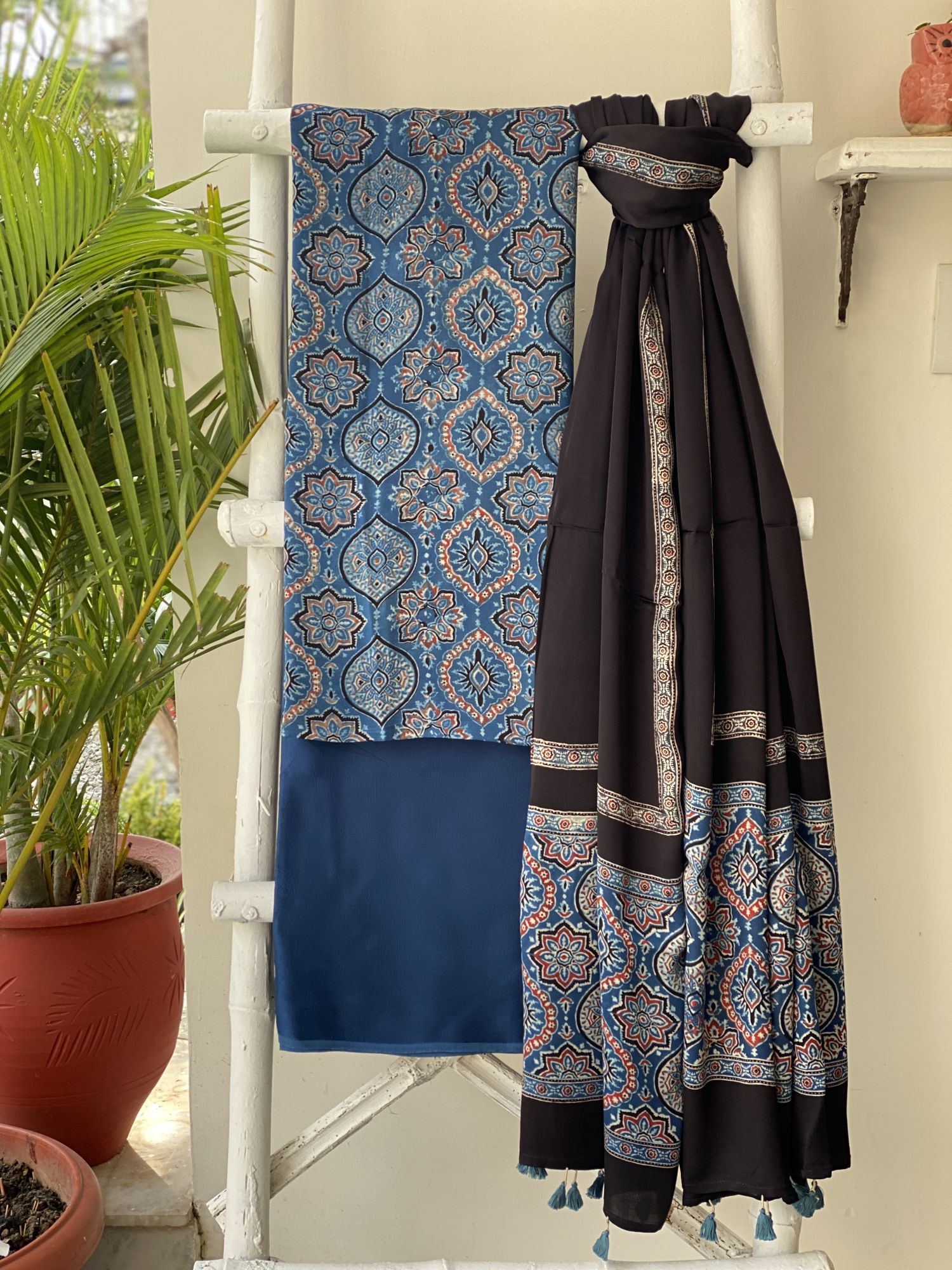 INDIGO hand dyed ajrakh block print modal silk shirt and INDIGO MODAL SILK PLAIN BOTTOM paired with A BLACK-INDIGO modal silk ajrakh block print dupatta, accessorised with tassles.